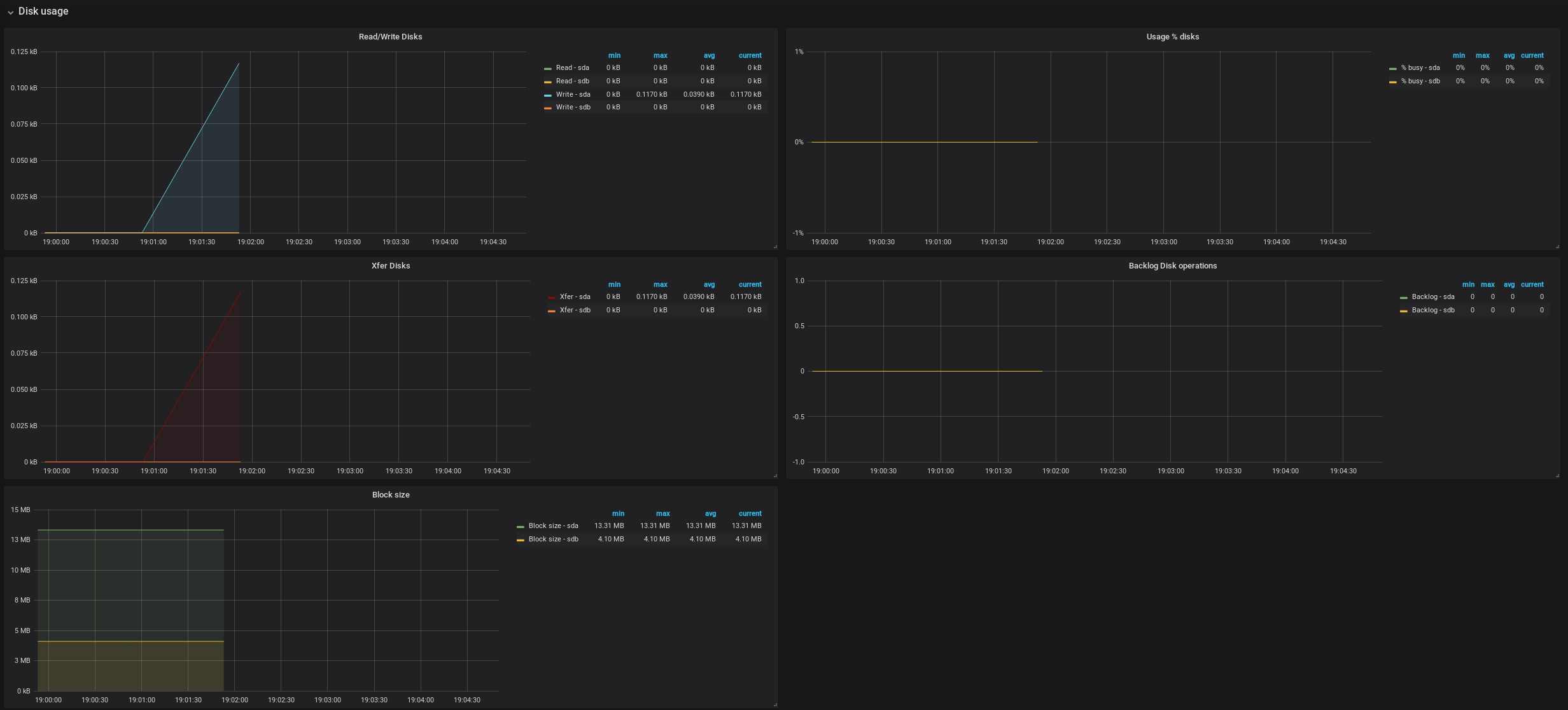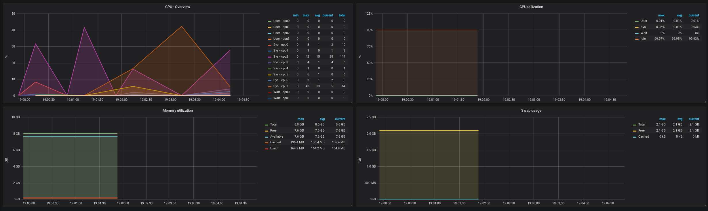 Dashboard with Njmon trends. I'm using InfluxDB data source. Graphs has been grouped what makes work easier (Don't need to scroll so much).
