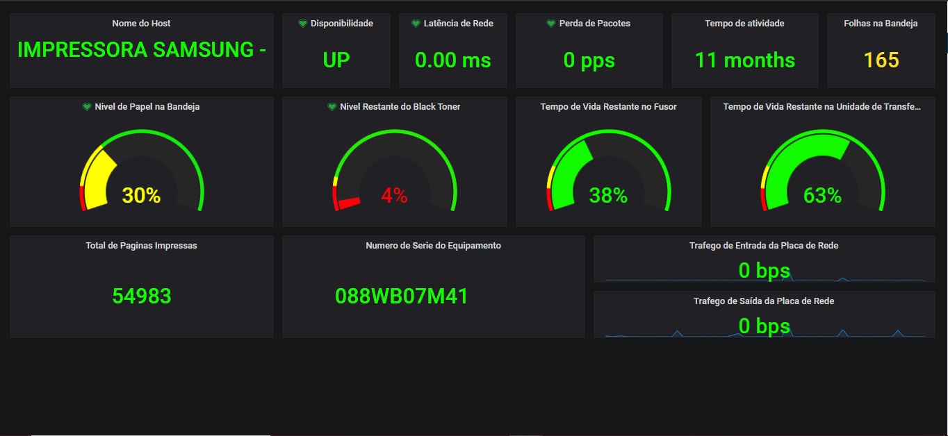 Dashboard criada para monitoramento básico de impressoras, para esta Dashboard foi utilizada a impressora Samsung M408x Series.