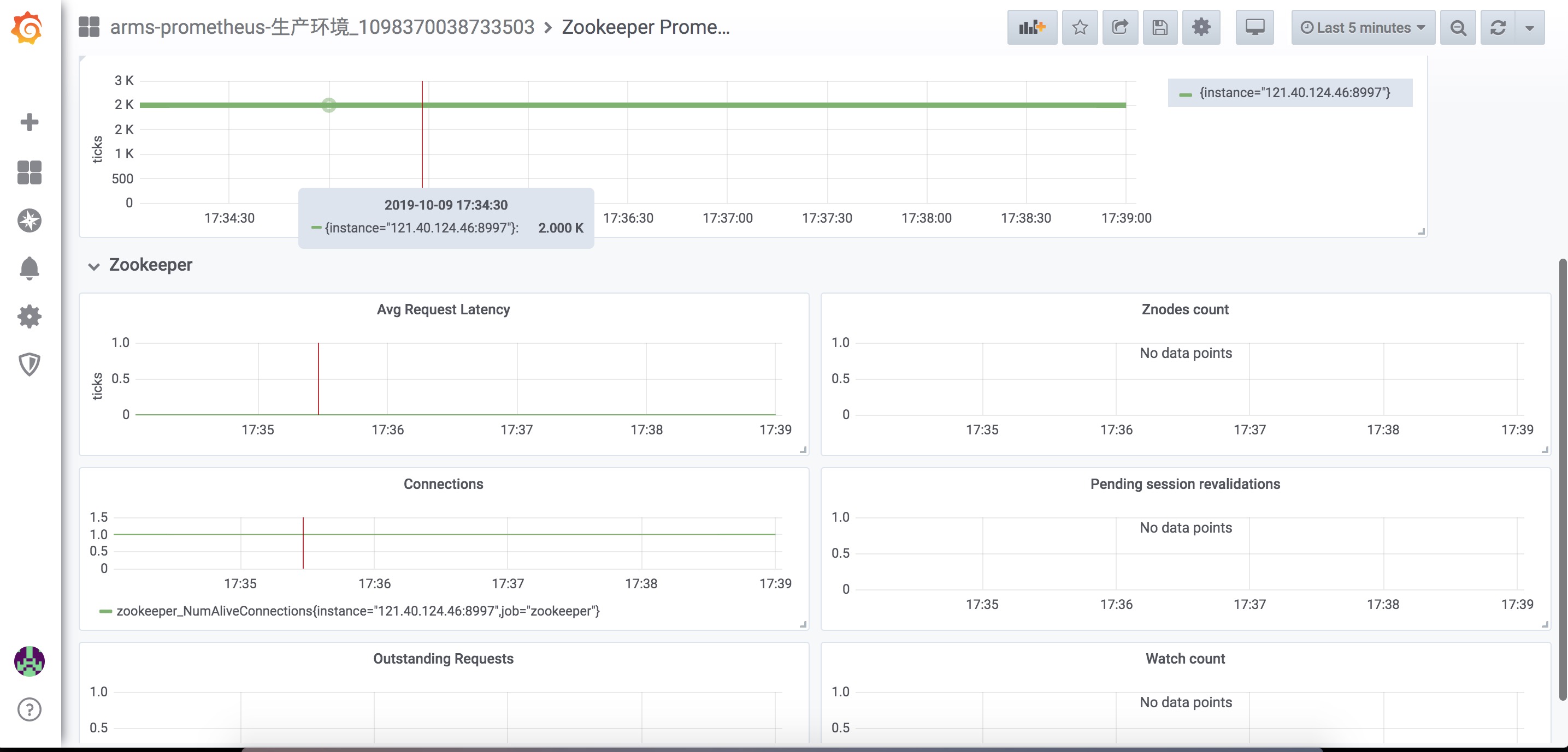 The Zookeeper Prometheus ARMS dashboard uses the prometheus data source to create a Grafana dashboard with the graph and singlestat panels.