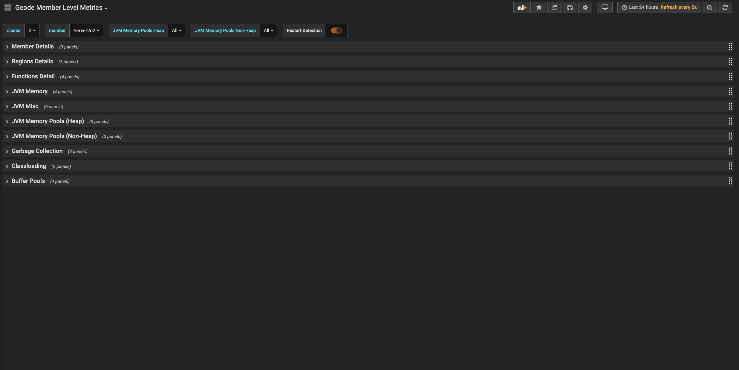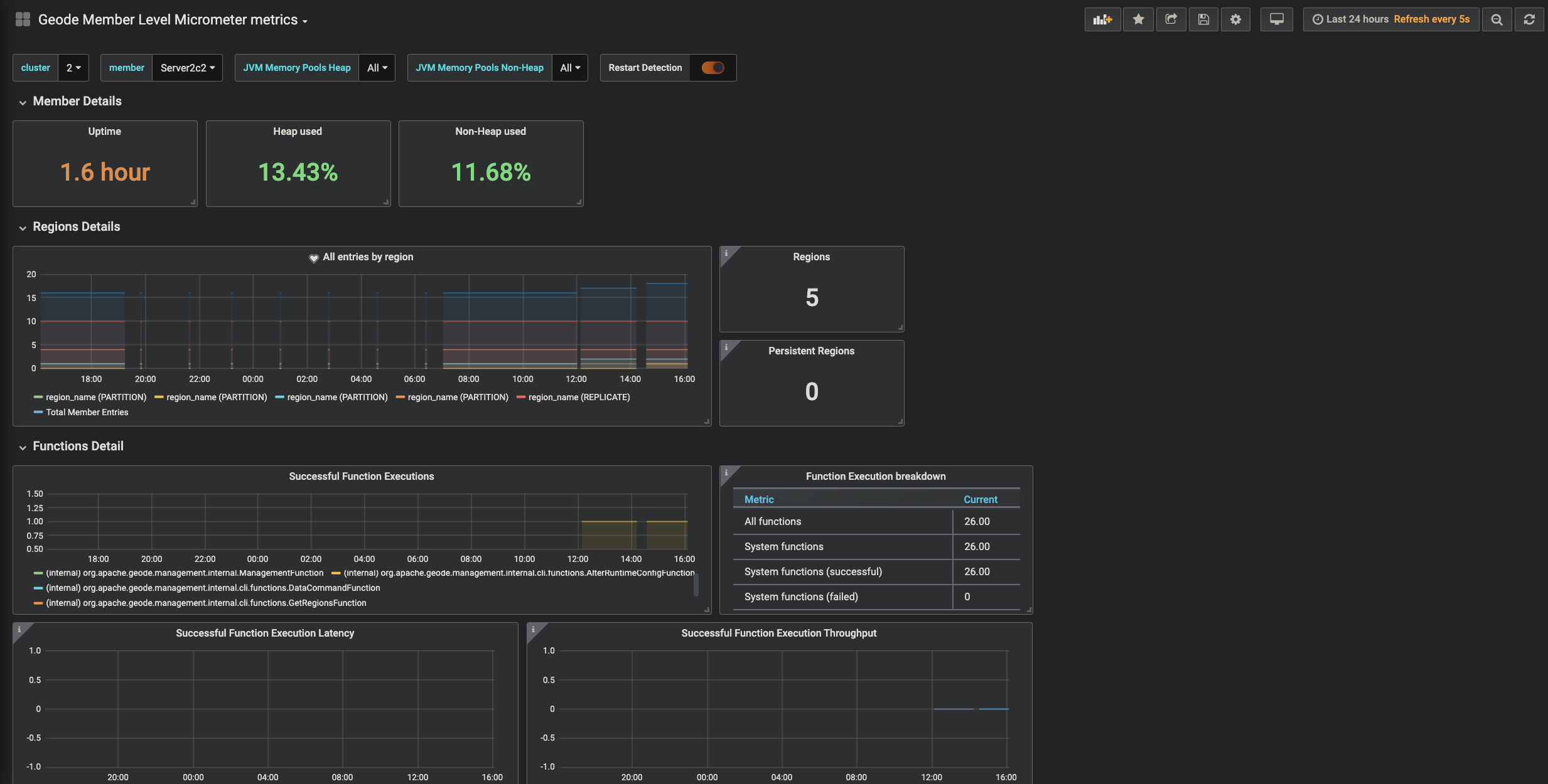 This Dashboard builds off of the Micrometer dashboard (4701), by adding filtering capabilities for any cluster/member combination of Geode. See examples in geode-examples for 'Geode micrometer metrics example' of how to expose metrics to Prometheus.