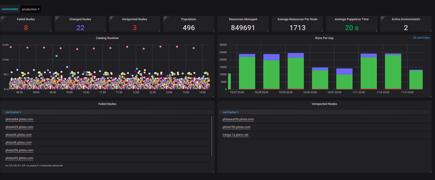 The Puppet Board dashboard uses the postgres data source to create a Grafana dashboard with the graph, singlestat and table panels.
