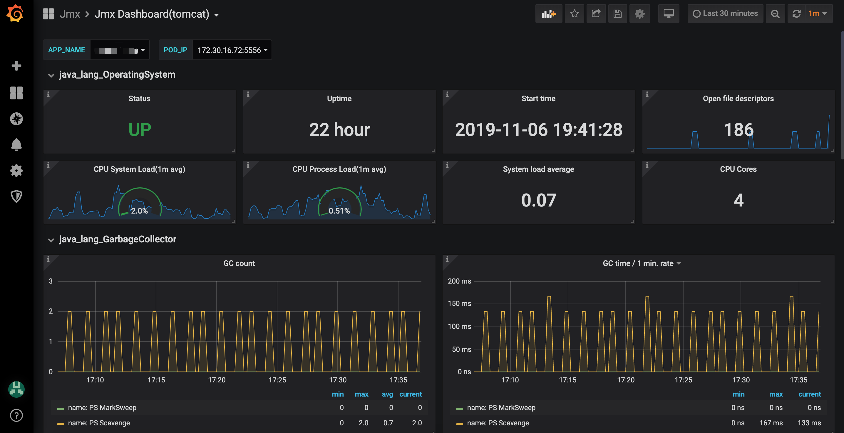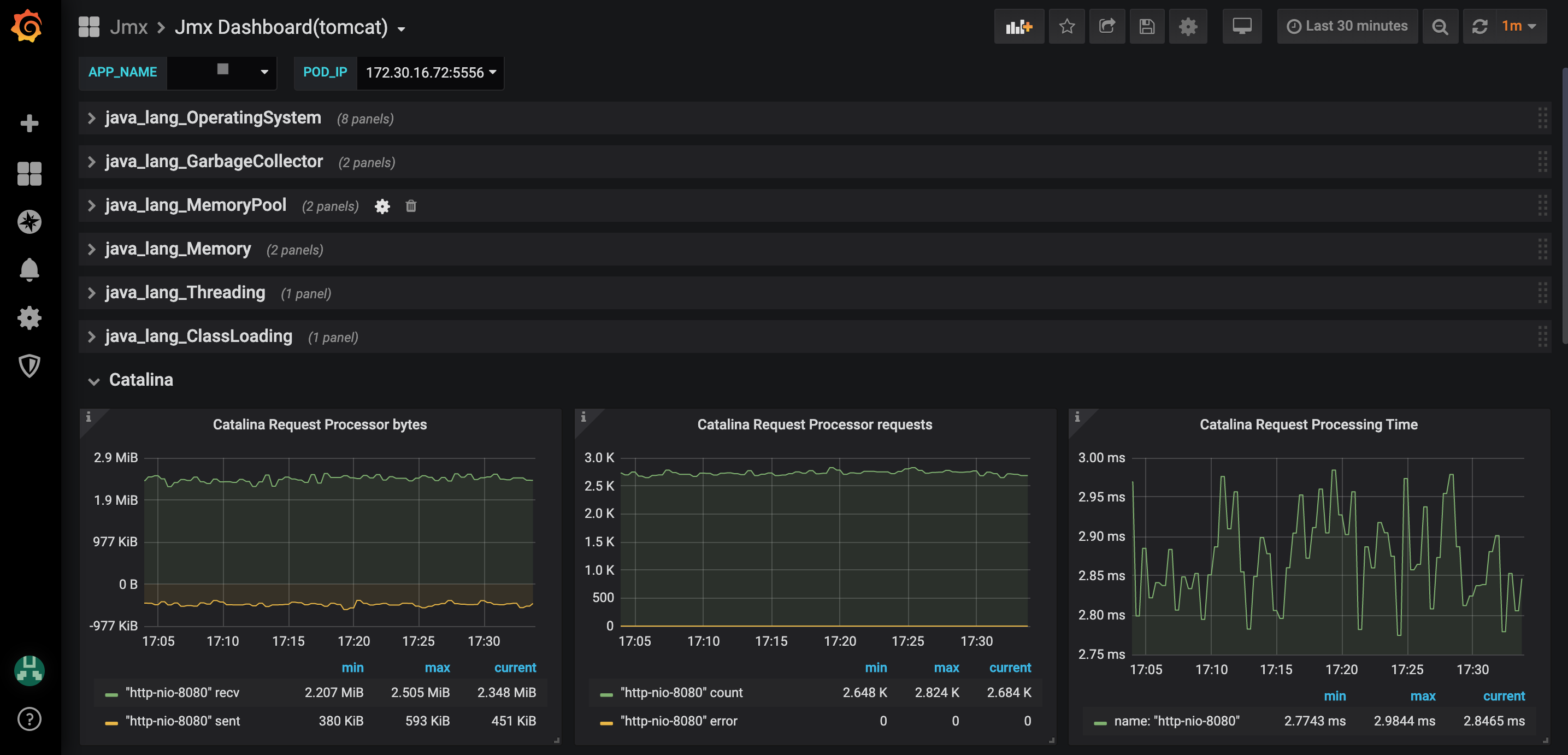 The Jmx Dashboard(tomcat) dashboard uses the prometheus data source to create a Grafana dashboard with the graph and singlestat panels.