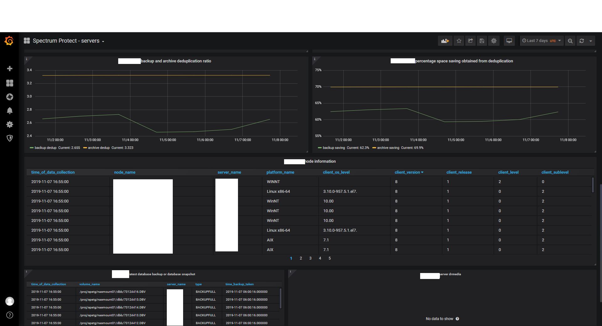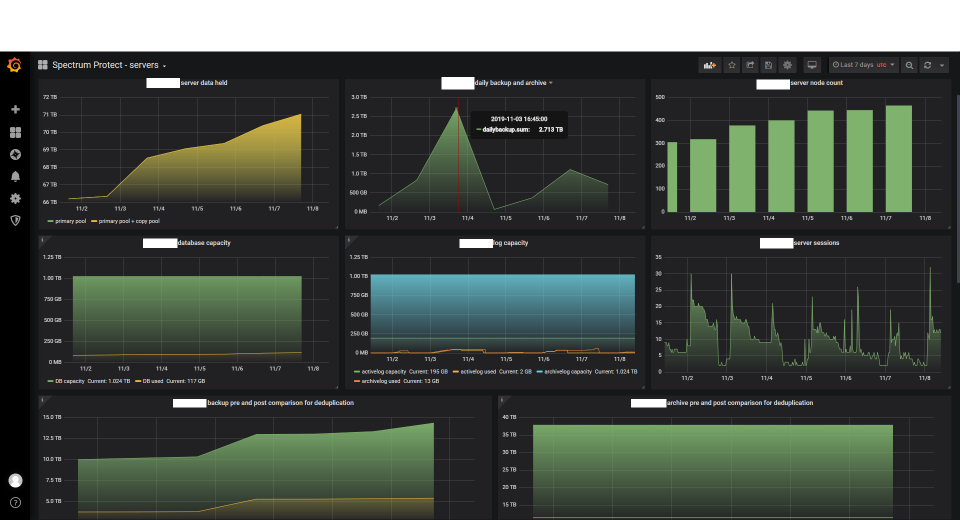 IBM Spectrum Protect data is collected via shell scripts running dsmadmc "SELECT" commands from a central server and then imported to InfluxDB.