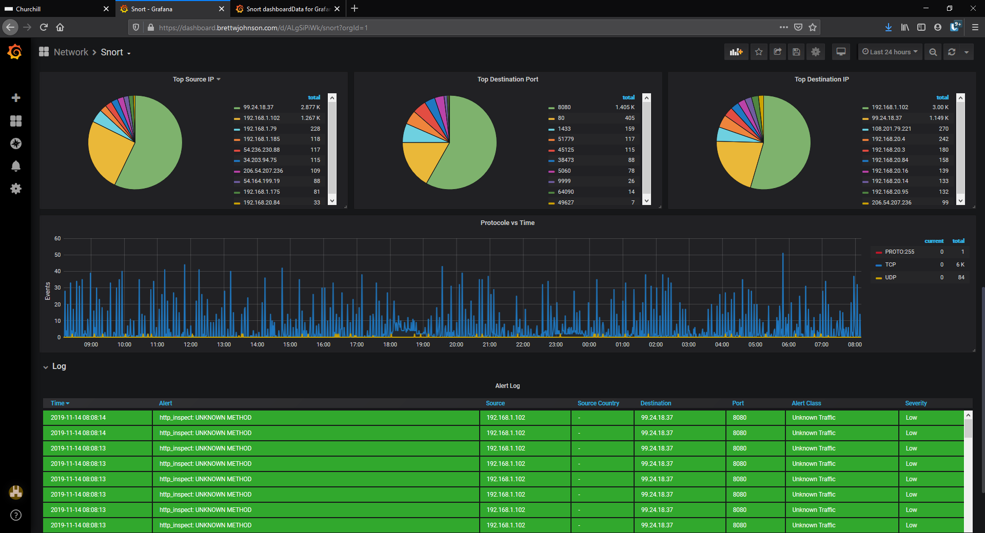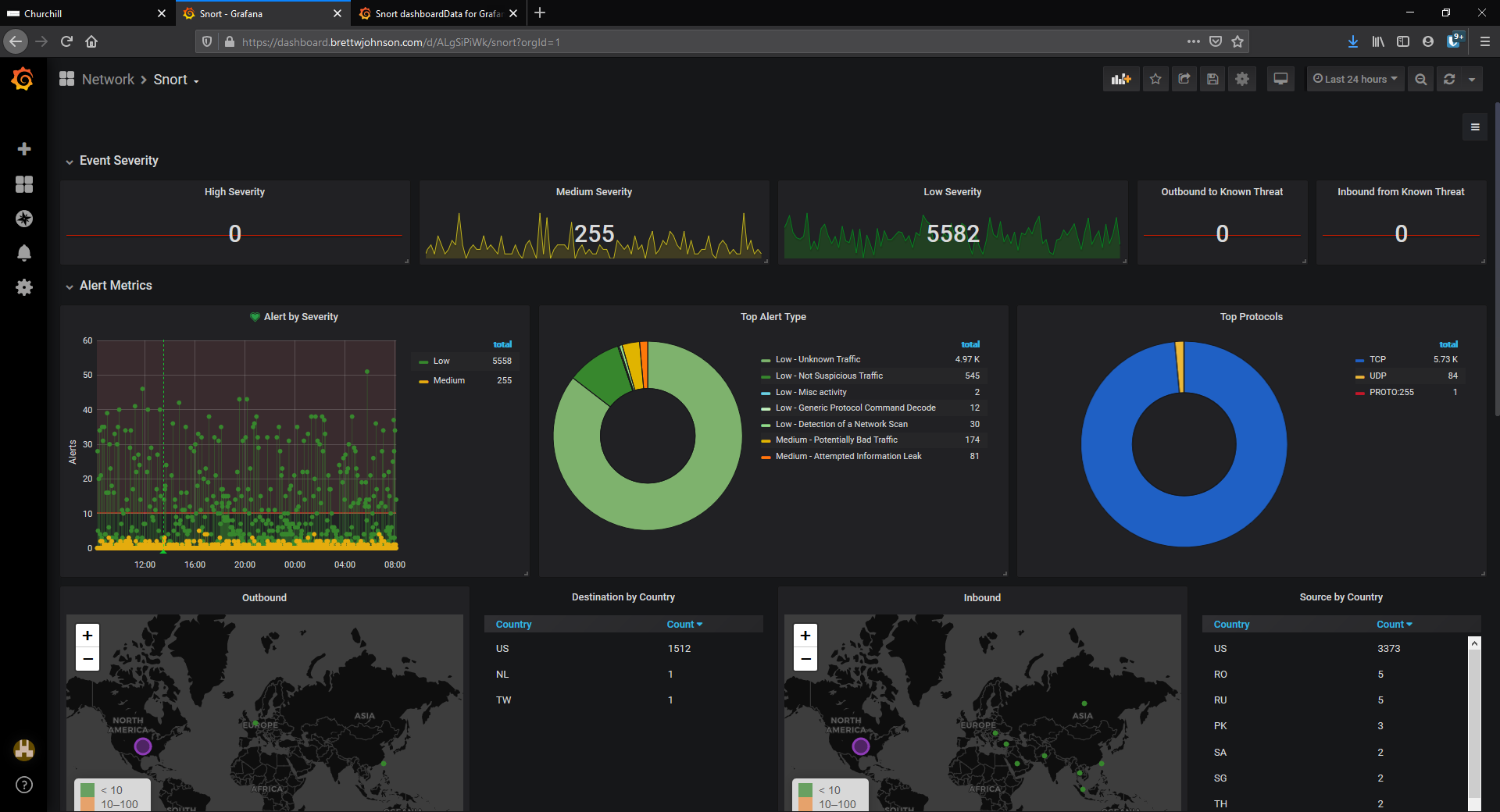 A Snort IDS/IPS dashboard build on Elastisearch, using data parsed from Graylog. Based on the setup from IT Security Labs: https://www.youtube.com/watch?v=WWitHleGFd8 And the original Security Panel dashboard by Tal Bar-Or: https://grafana.com/grafana/dashboards/3099