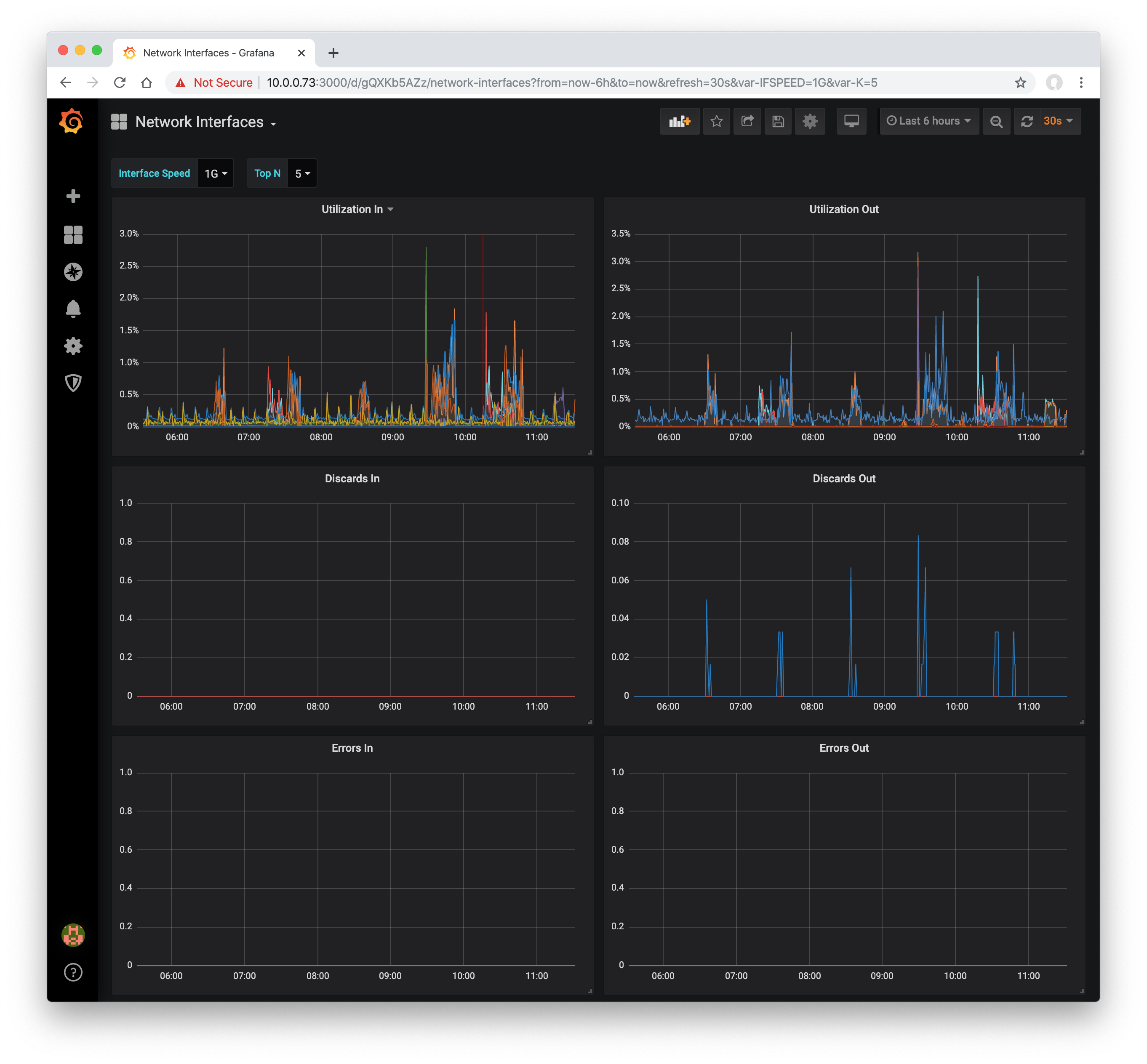 This dashboard displays busiest network interfaces reported by sFlow-RT analyzer. The sFlow-RT analysis software collects streaming telemetry from industry standard sFlow Agents embedded in network devices.