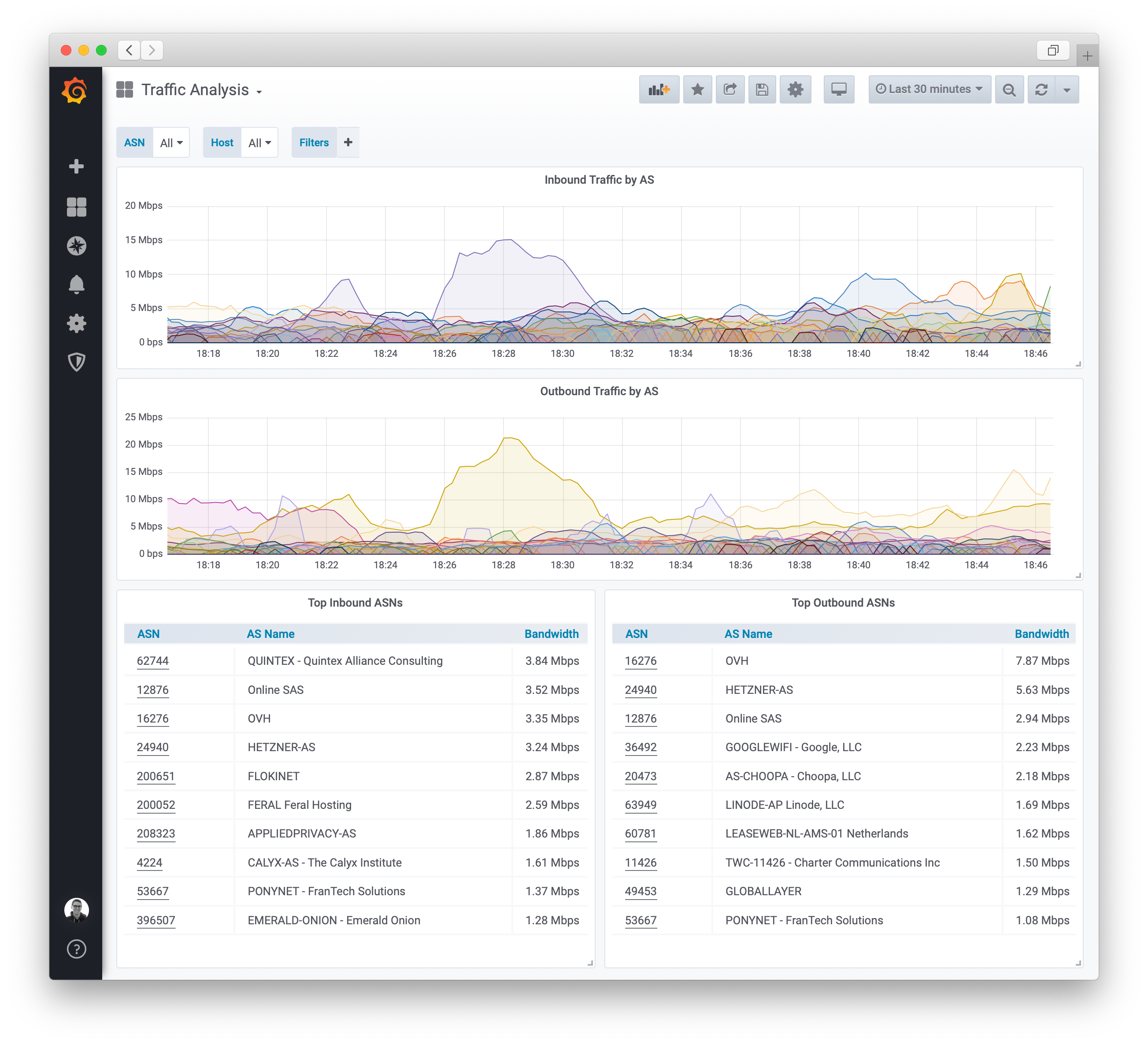 This dashboard visualizes the data collected by Flow Exporter to showcase which autonomous systems a series of routers are exchanging traffic with.
