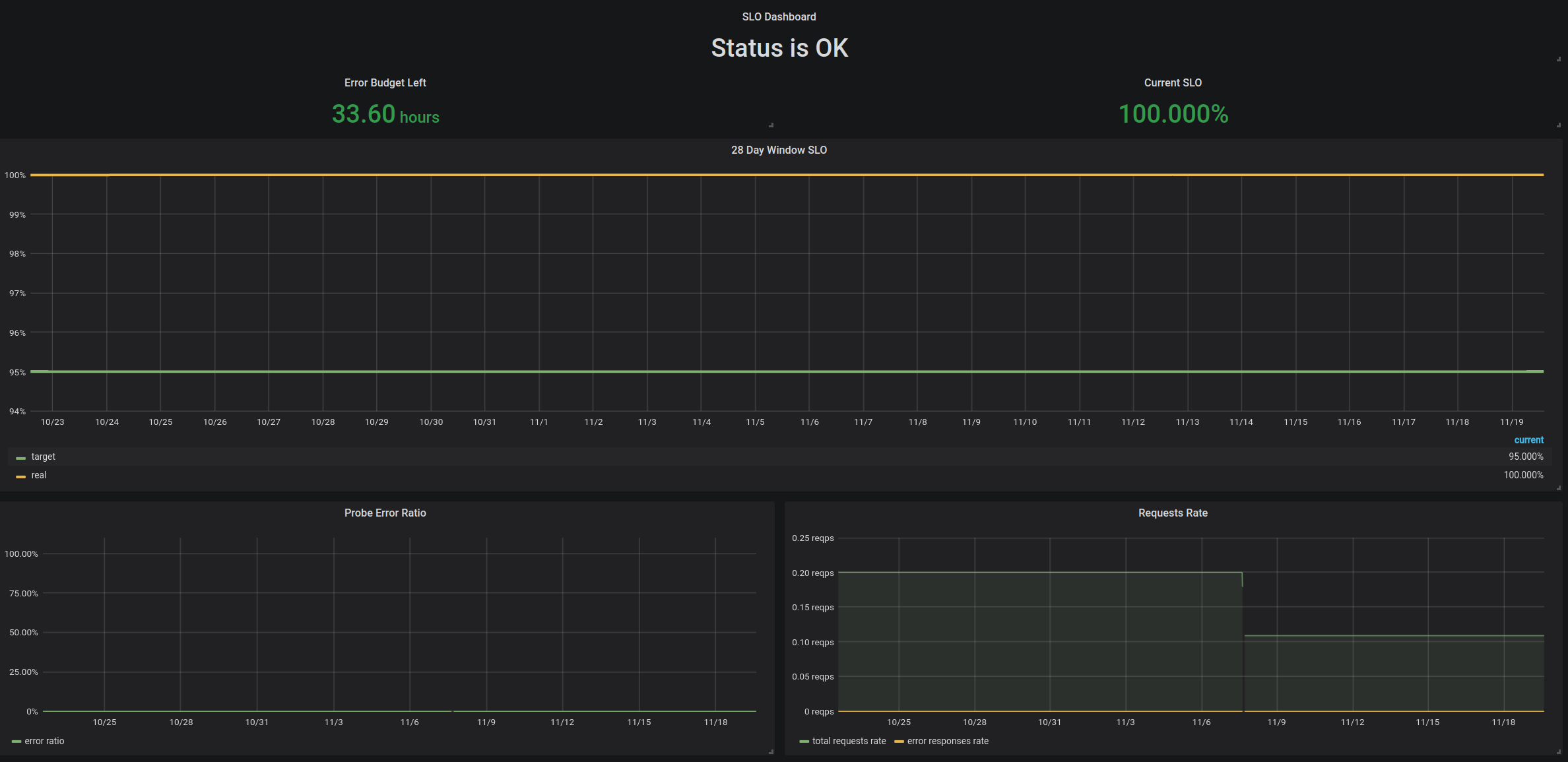 The dashboard assumes that there is a probe, which probes service's availability and exports the data using metrics, which are then used by this dashboard. There are supposed to be two metrics exposed, which can have any name (it is configurable in the parameters):