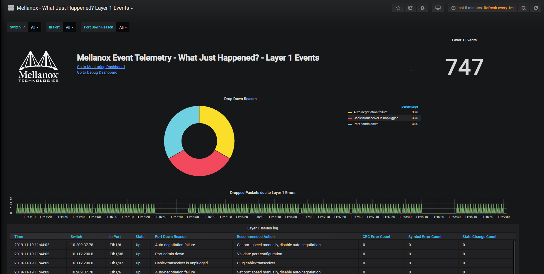 The Layer 1 dashboard provides real-time pane to view events and dropped packets caused by Layer 1 errors