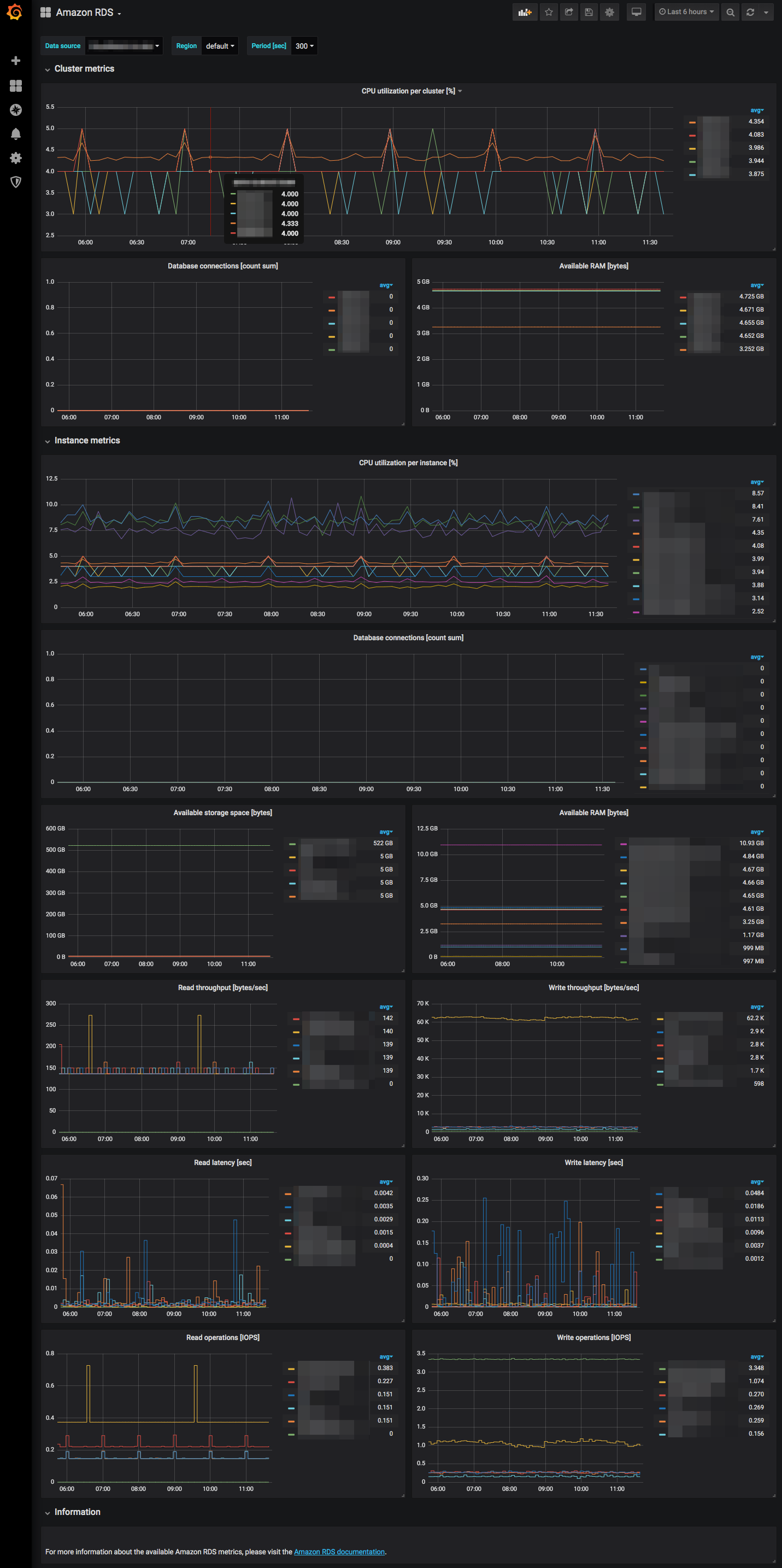 The Amazon RDS dashboard uses the cloudwatch data source to create a Grafana dashboard with the graph and text panels.