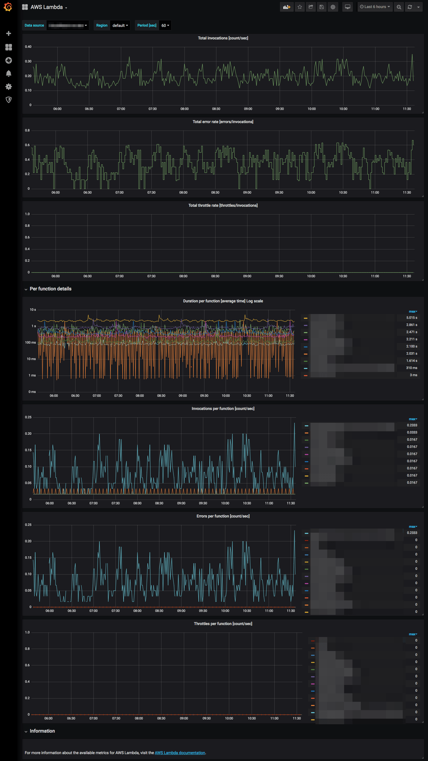 The AWS Lambda dashboard uses the cloudwatch data source to create a Grafana dashboard with the graph and text panels.