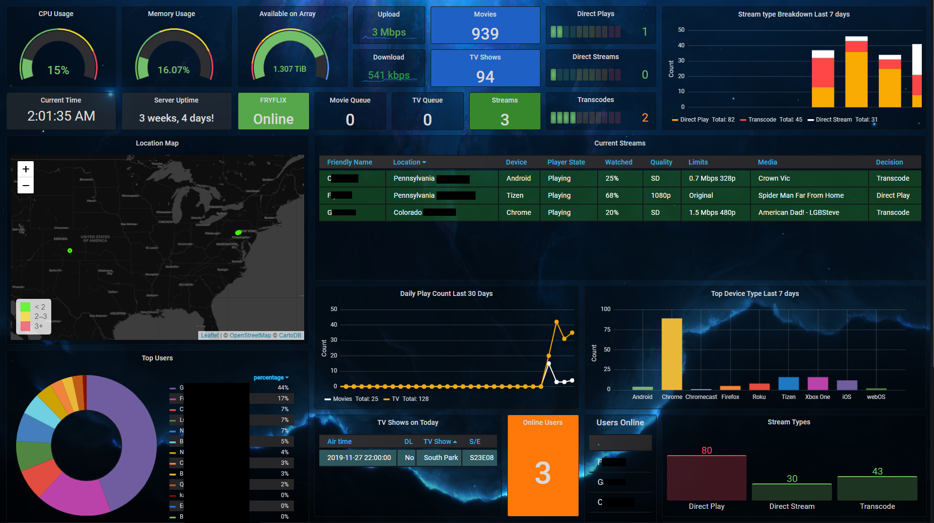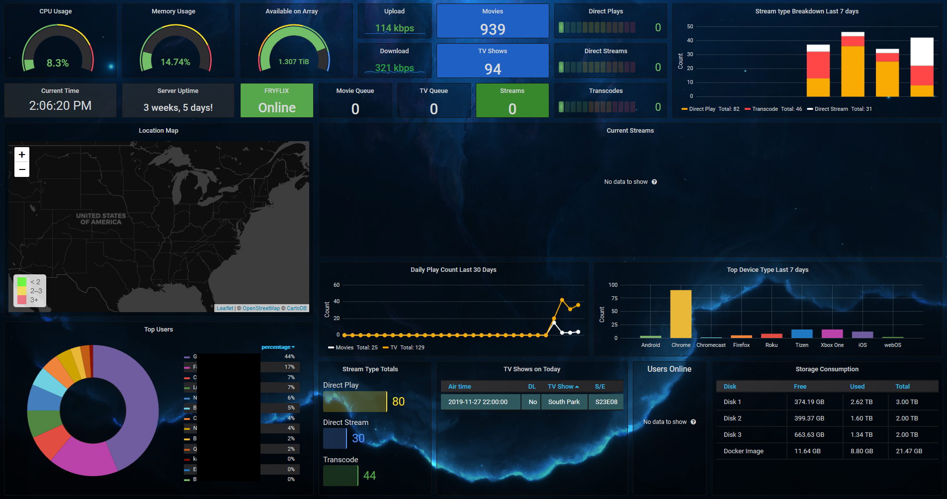 Aggregates data from Varken for Plex and system info for Unraid. Required containers: Varken, InfluxDB, Telegraf, Plex, Tautulli, Grafana
