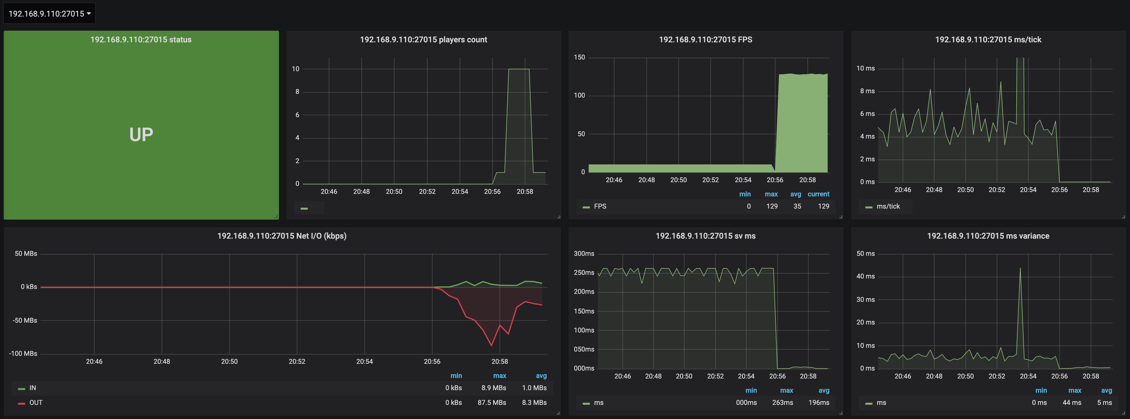 This dashboard displays different metrics collected by the srcds_exporter available at the following address : https://github.com/Unyxos/srcds_exporter