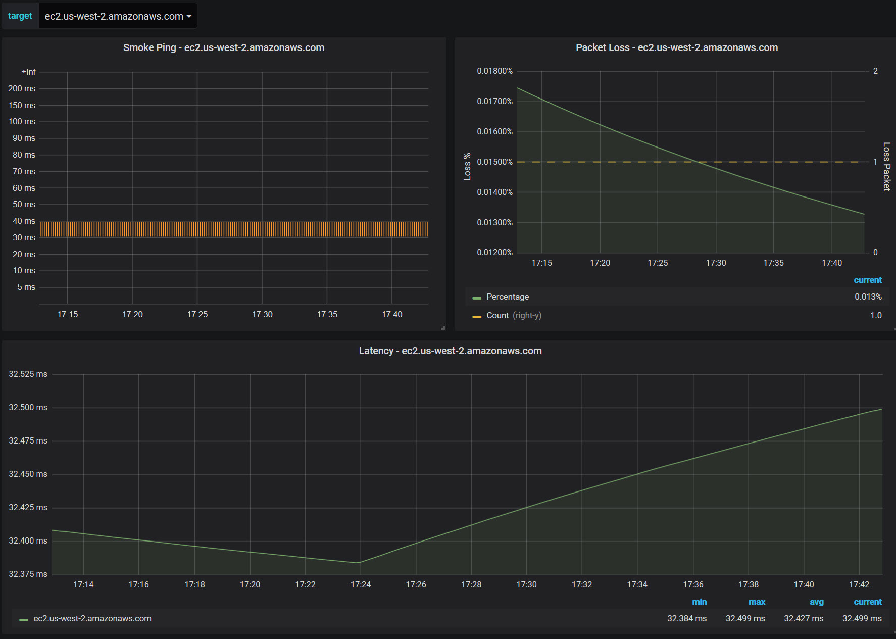Smoke Ping using https://github.com/SuperQ/smokeping_prober with latency heatmap latency graph packet loss gragh