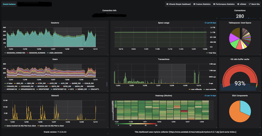 This is a bit tricky... but You can have this Grafana dashboard working with Oracle Databases without any additional license cost. You need to install the my4ora PL/SQL collector ( https://www.xenialab.it/meo/web/pub/my4ora-0.0.7.zip ) and use an ETL to upload the statisctics on a PostgreSQL database repository.