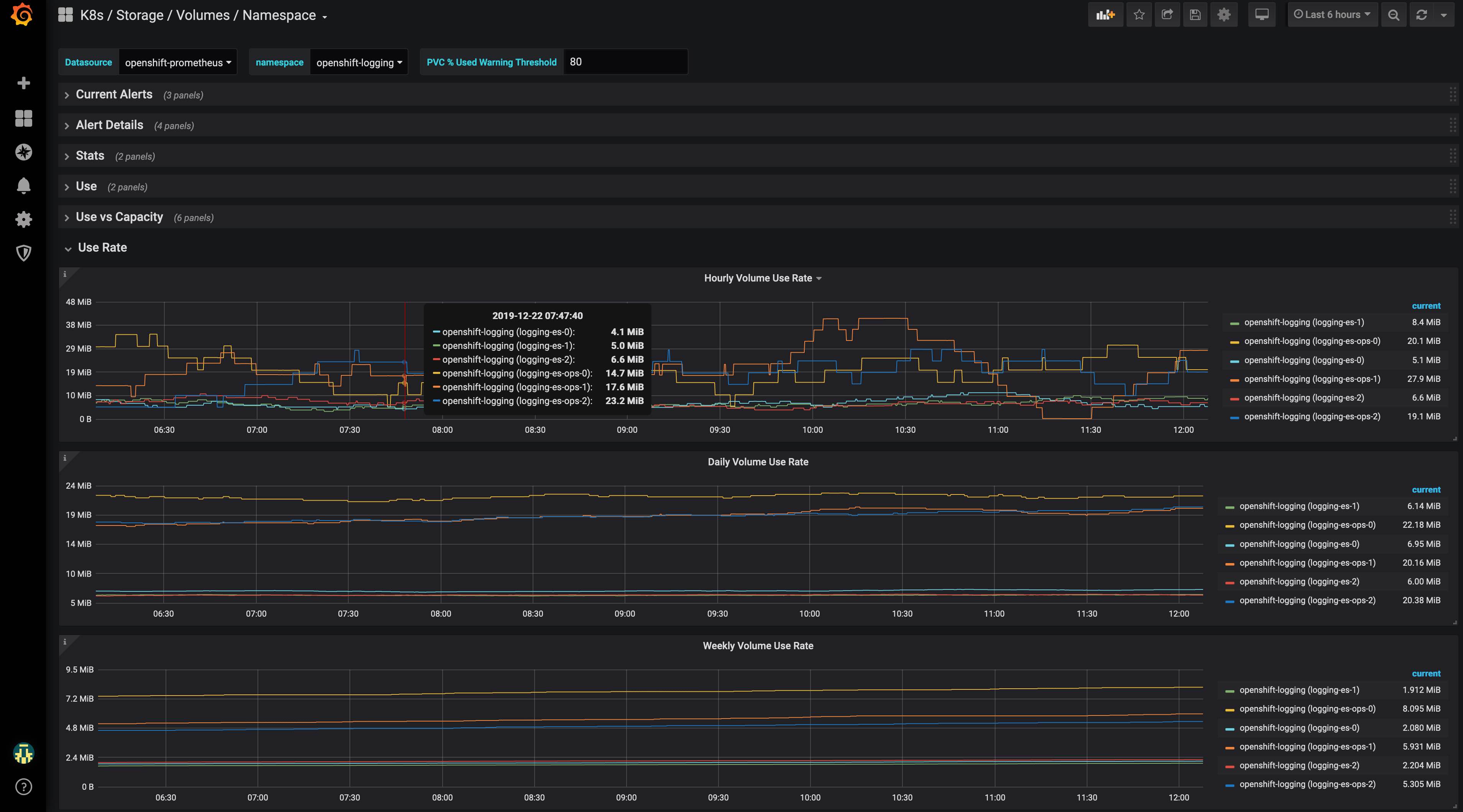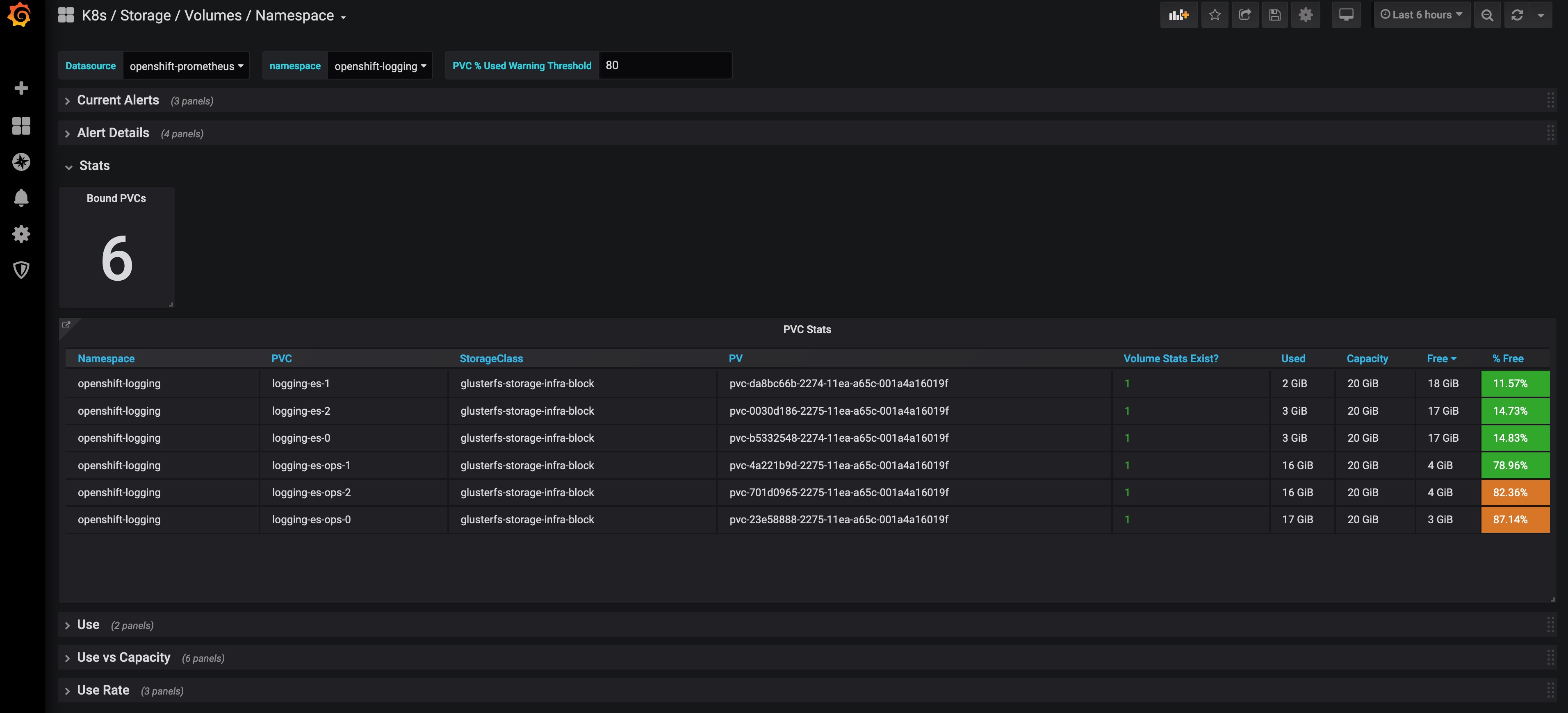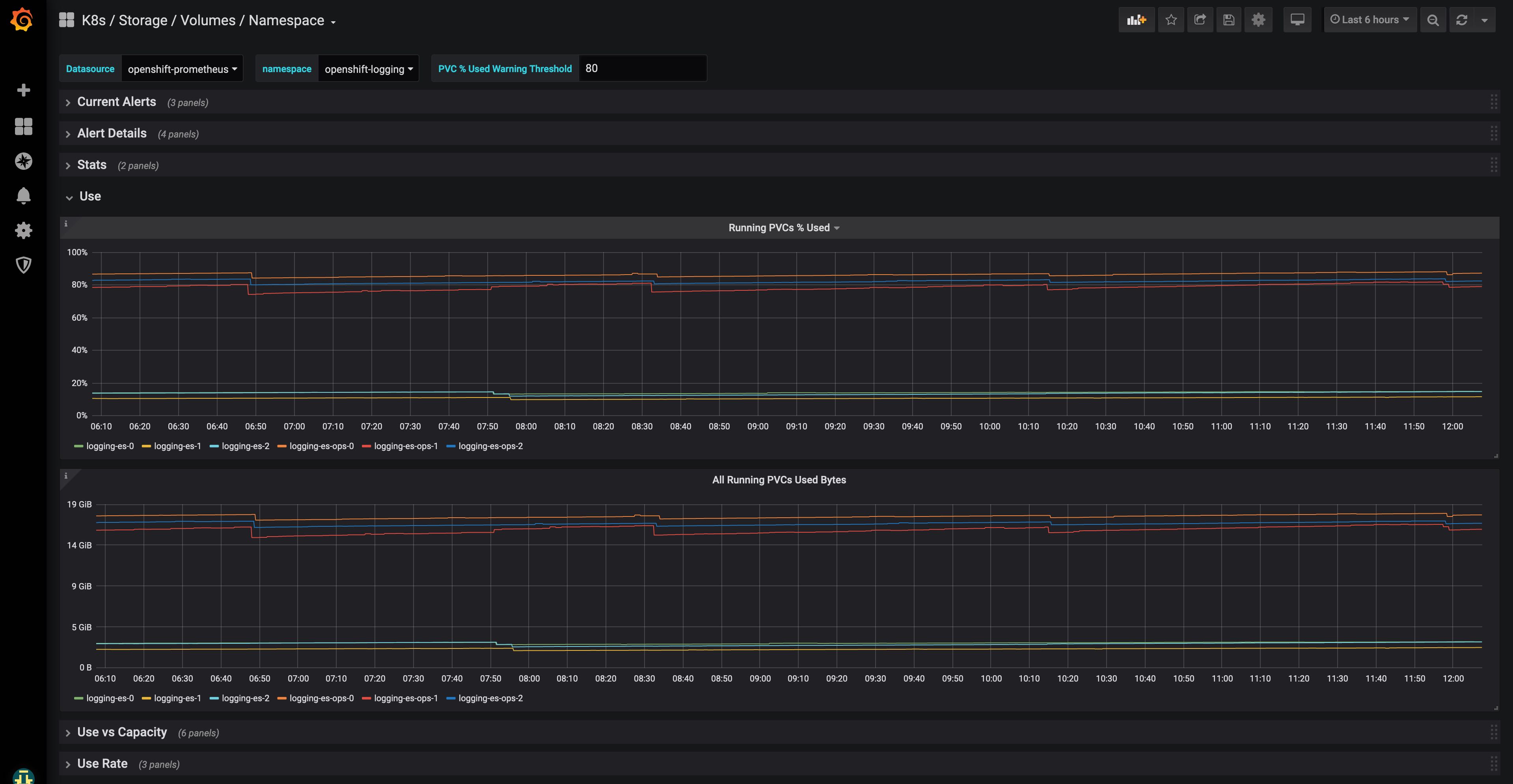 Dashboard of Kubernetes / OpenShift volume information at namespace level as exported by Prometheus connected to Kubernetes / OpenShift.