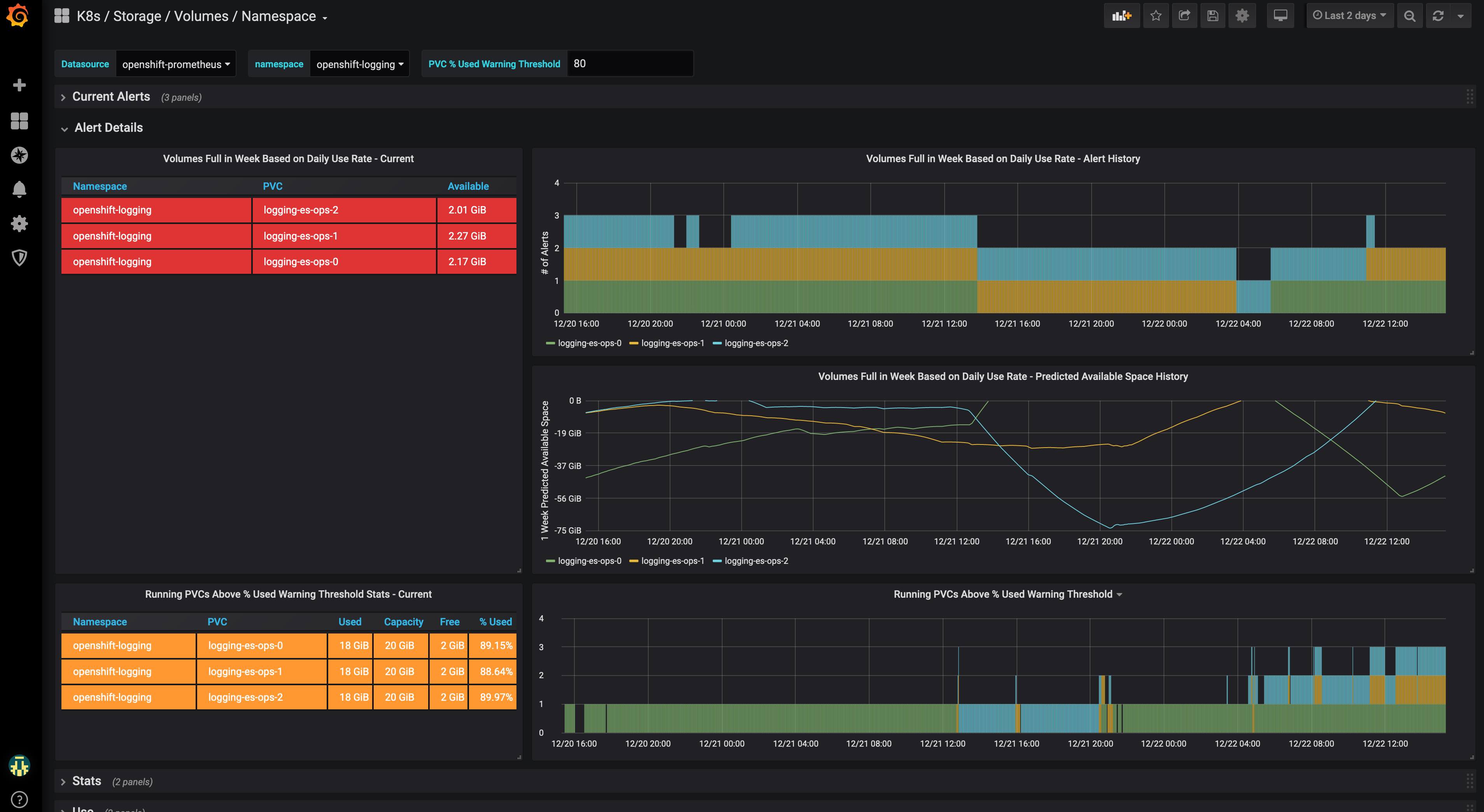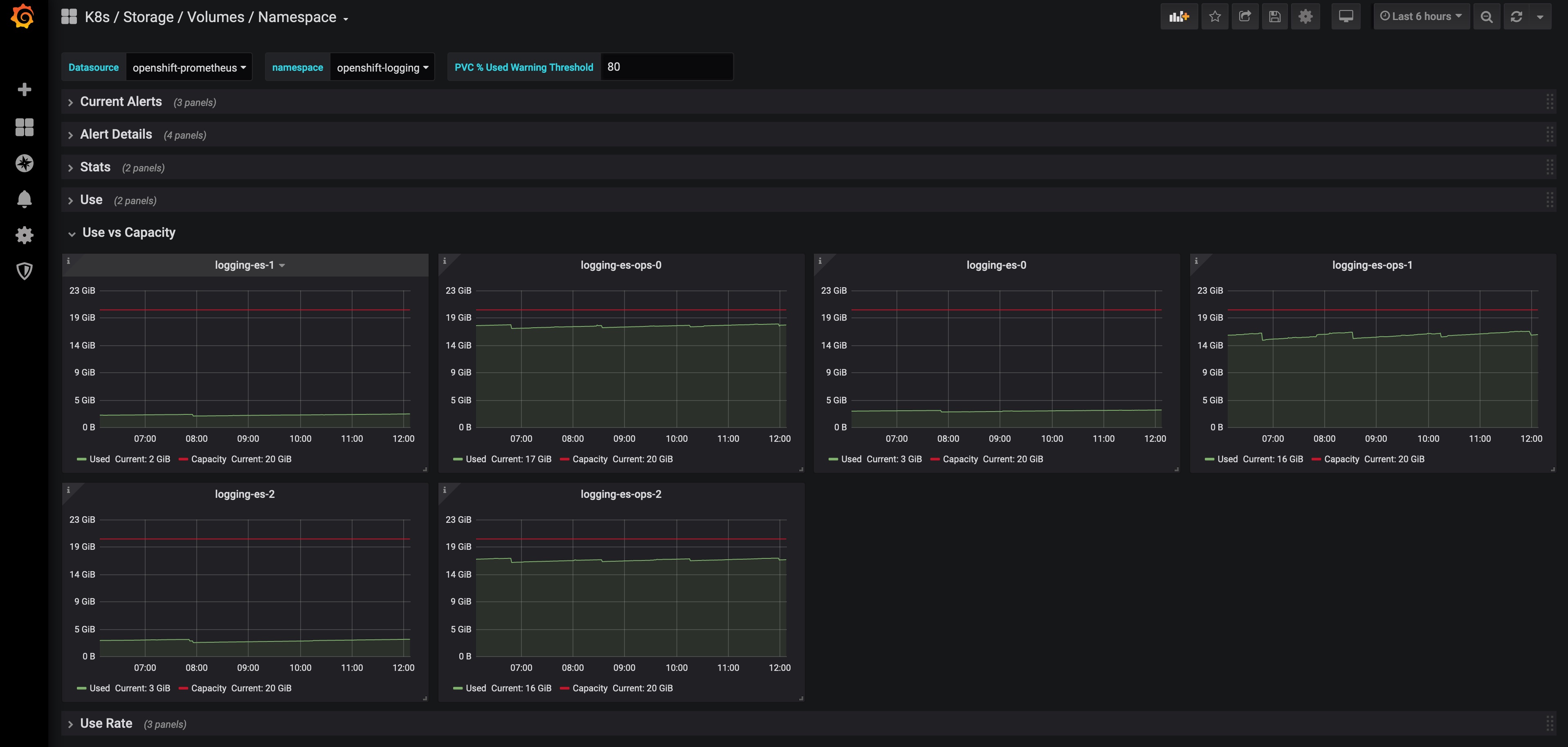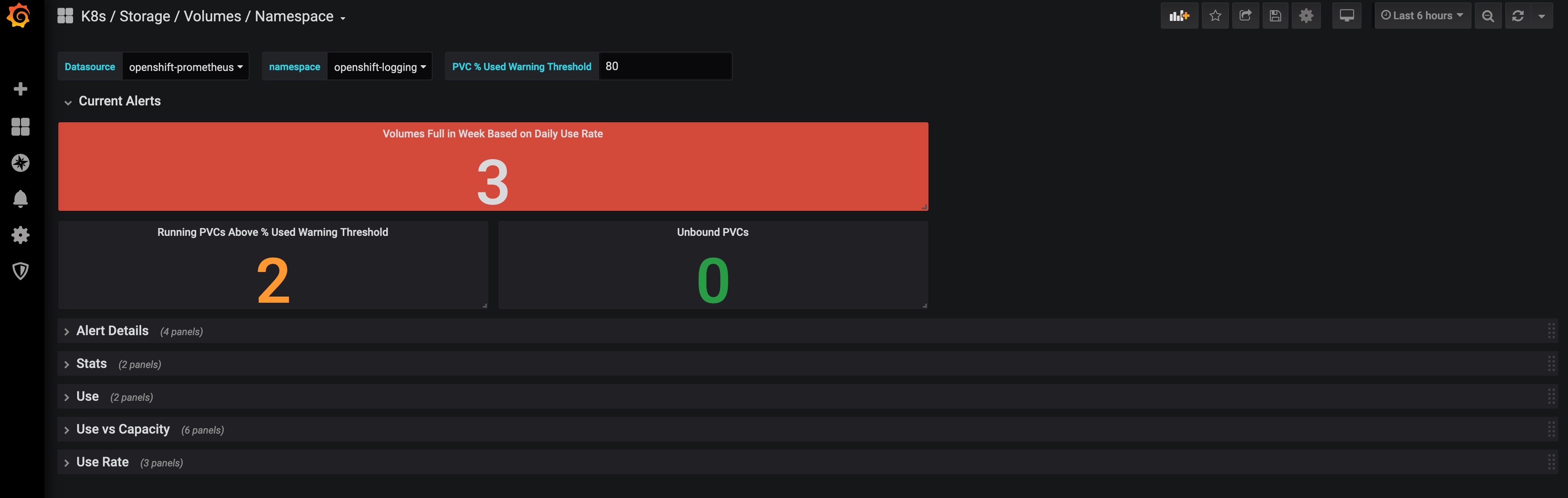 Dashboard of Kubernetes / OpenShift volume information at namespace level as exported by Prometheus connected to Kubernetes / OpenShift.