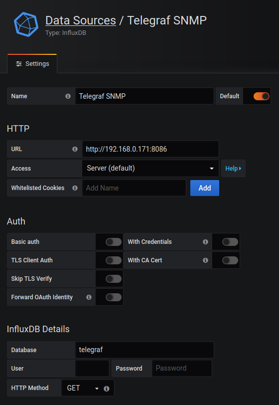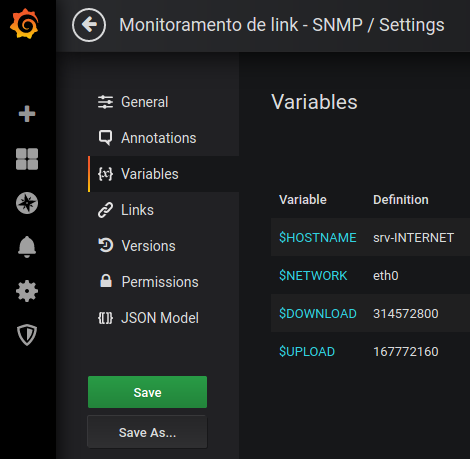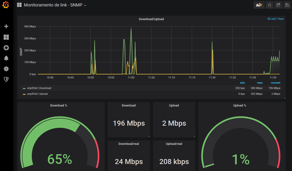 The Monitoramento de link - SNMP dashboard uses the influxdb data source to create a Grafana dashboard with the gauge, graph and singlestat panels.