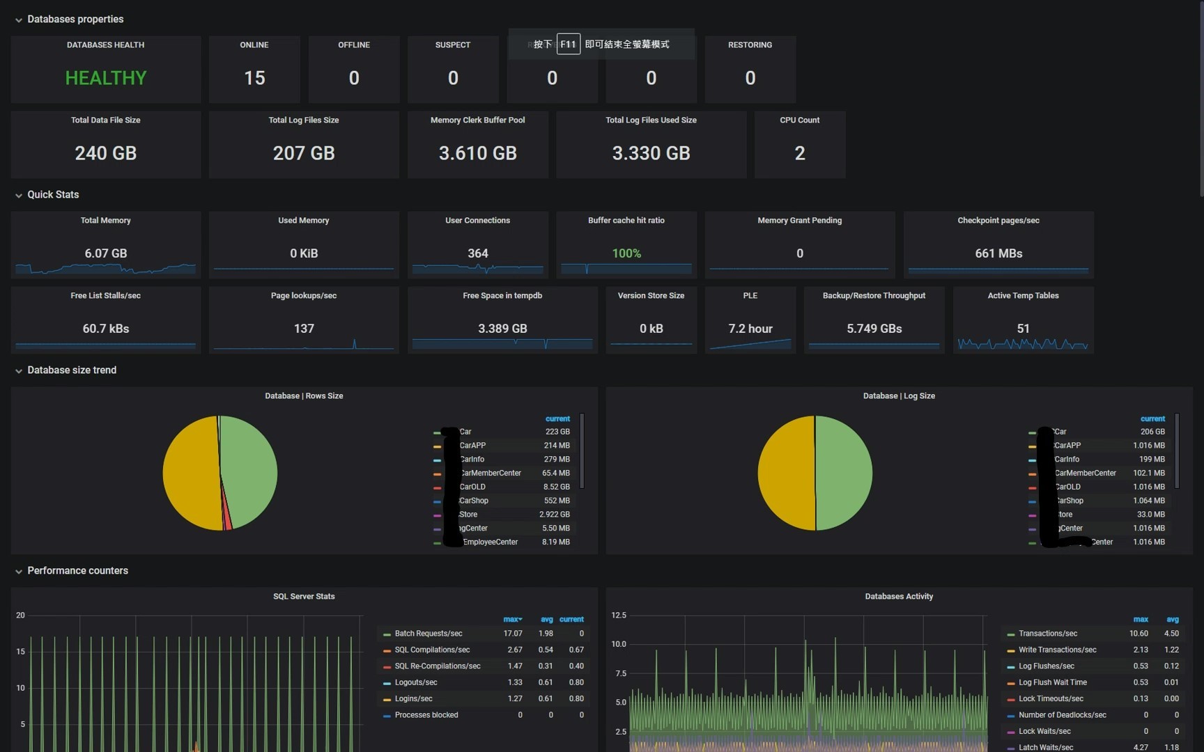 The SQL Server Monitoring with prometheus dashboard uses the prometheus data source to create a Grafana dashboard with the grafana-piechart-panel, graph and singlestat panels.