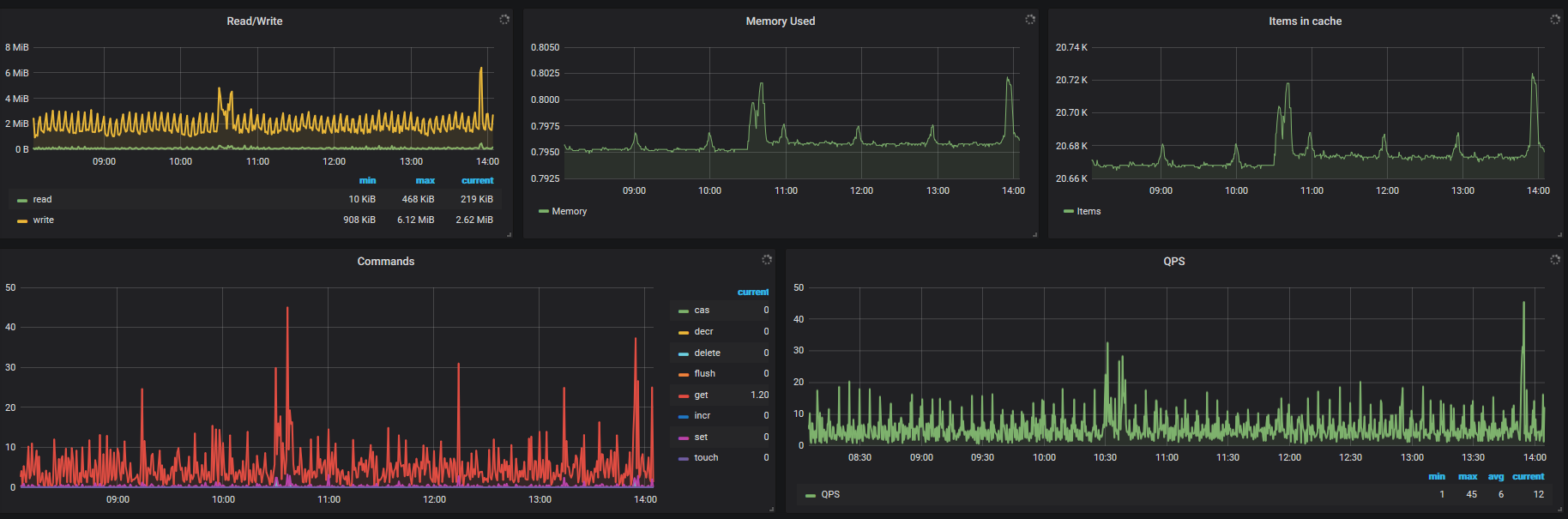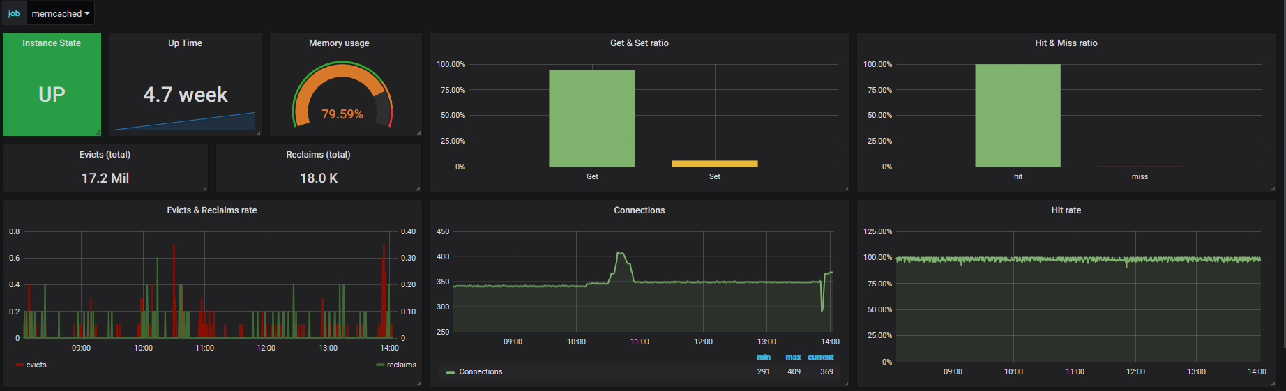 Memcached dashboard for grafana 6.5.1 or above. DataSource: Prometheus Collector: Memcached official exporter : https://github.com/prometheus/memcached_exporter/releases