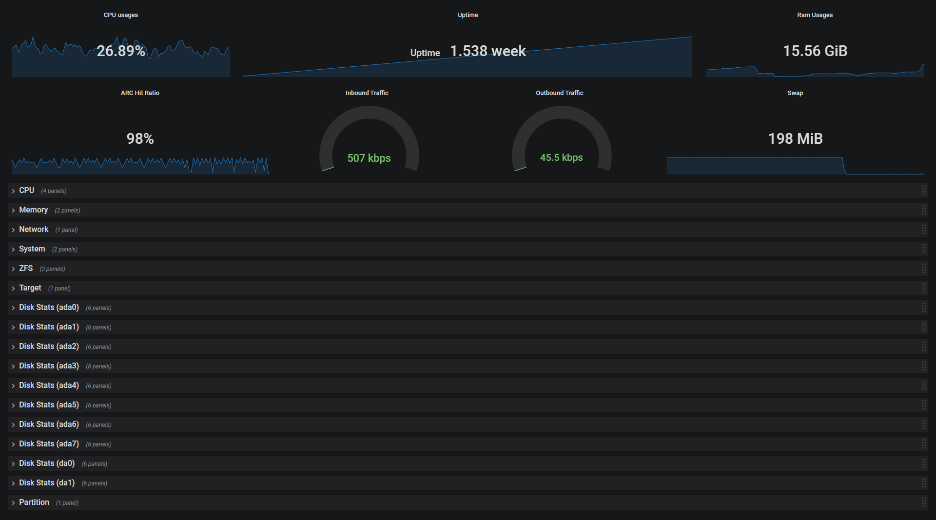 The report on the FreeNAS legacy interface was re-created as Grafana. I tried to make it as similar as possible. Set 'Remote Graphite Server Hostname' of FreeNAS to the address of InfluxDB and set the graphite and rp and cq on the InfluxDB.