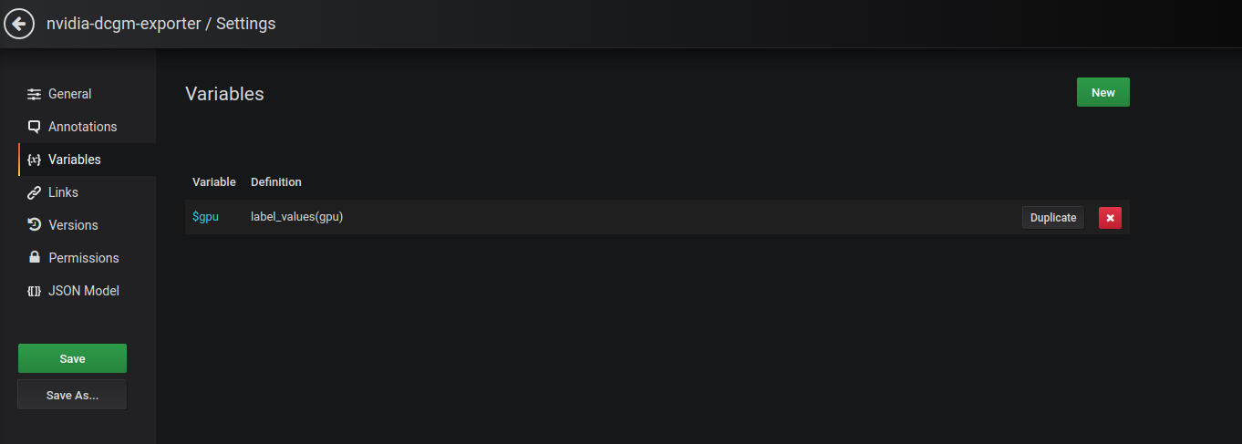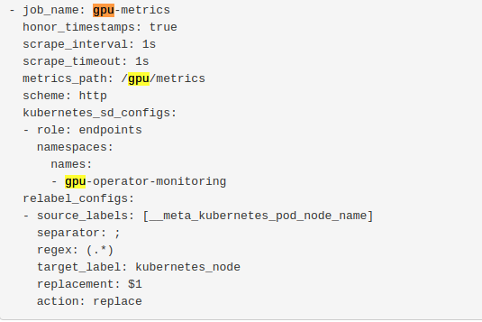 This dashboard displays GPU metrics collected from NVIDIA dcgm-exporter via a metric endpoint added to Prometheus. A separate endpoint is added to Prometheus via a scrape configmap as shown in the screenshot. You will need to update the Prometheus url in the datasource section for Grafana the display metrics. You can find all the steps here