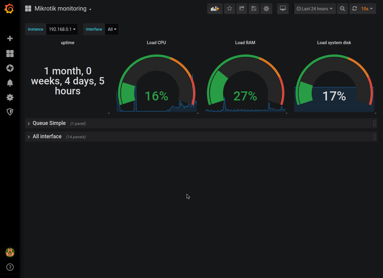 Monitoring mikrotik instances with grafana and prometheus via protocol SNMP.