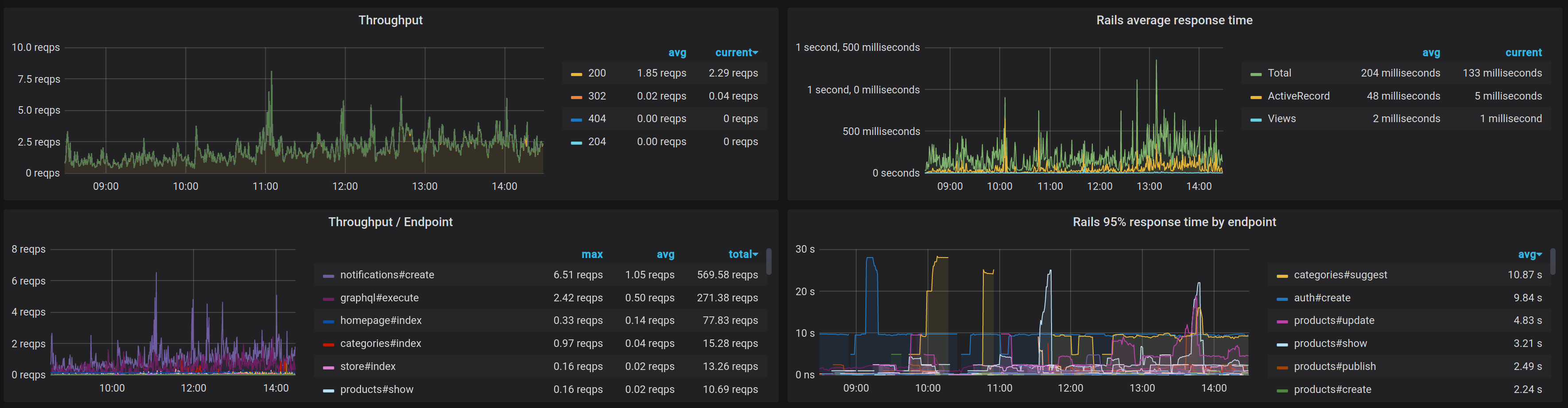 This dashboard is an example of visualization of metrics provided by yabeda-rails gem for monitoring Ruby on Rails applications with Yabeda – extendable suite for collecting and exporting of Ruby apps' metrics.