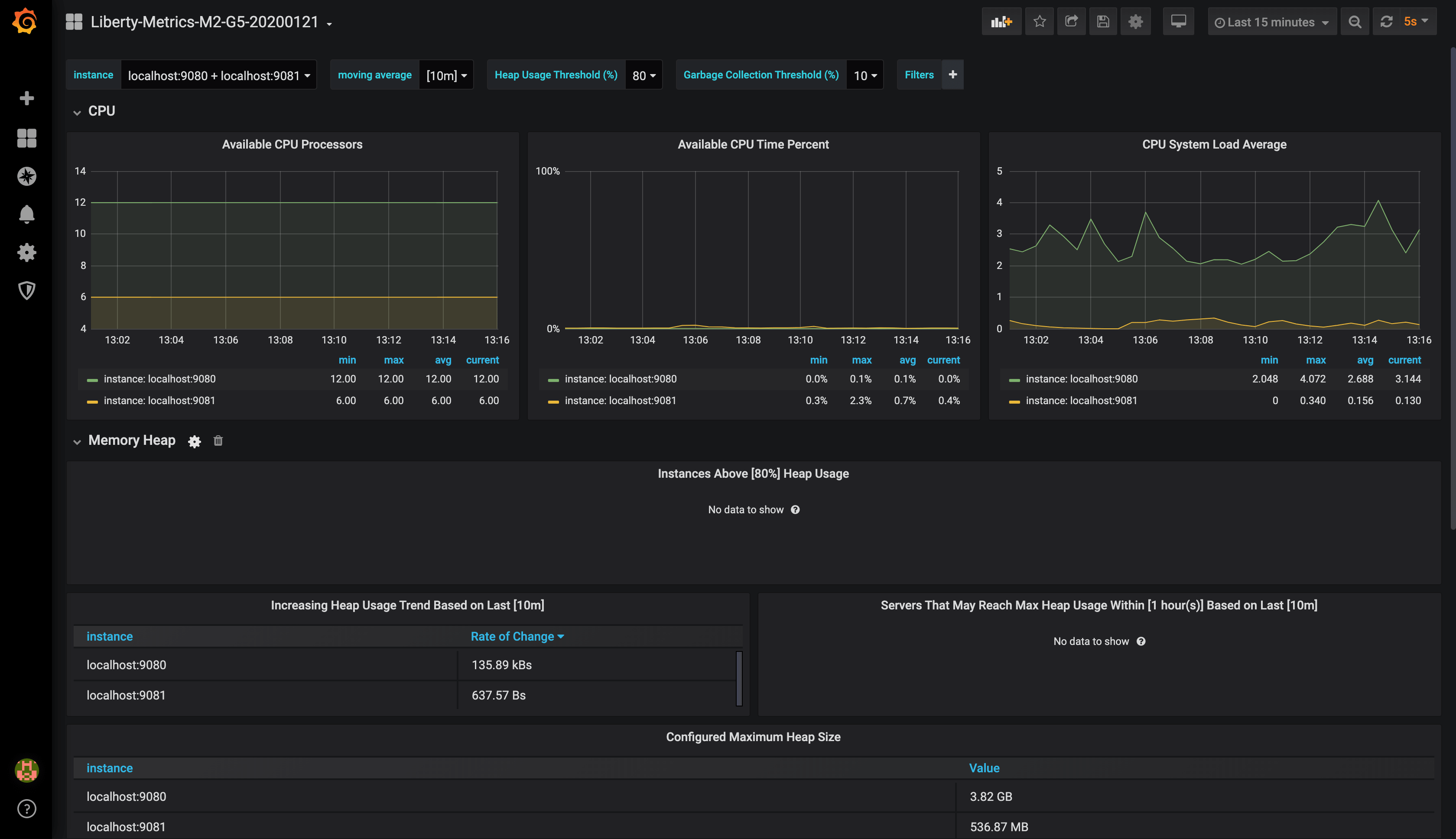 This dashboard works with Open Liberty servers running with mpMetrics-2.x, mpMetrics-3.x and mpMetrics-4.x features. For mpMetrics-5.0, use the Open Liberty - mpMetrics-5.0 dashboard