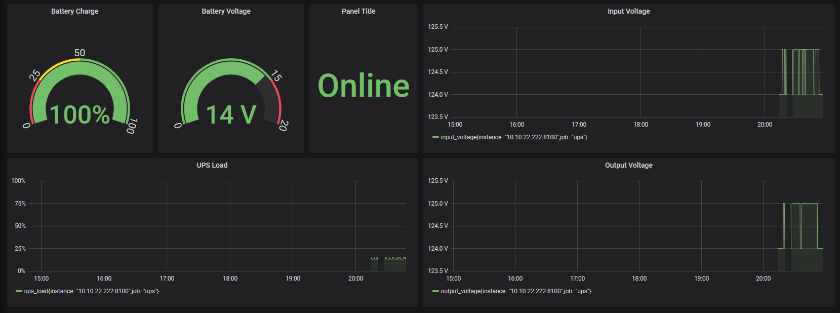 This is a dashboard providing and overview of metrics that are produced NUT via the prometheus NUT exporter found here: https://github.com/p404/nut_exporter