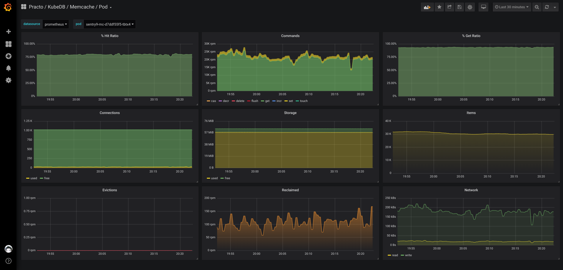 Memcache metrics dashboard for Kubernetes created with KubeDB and Prometheus metrics