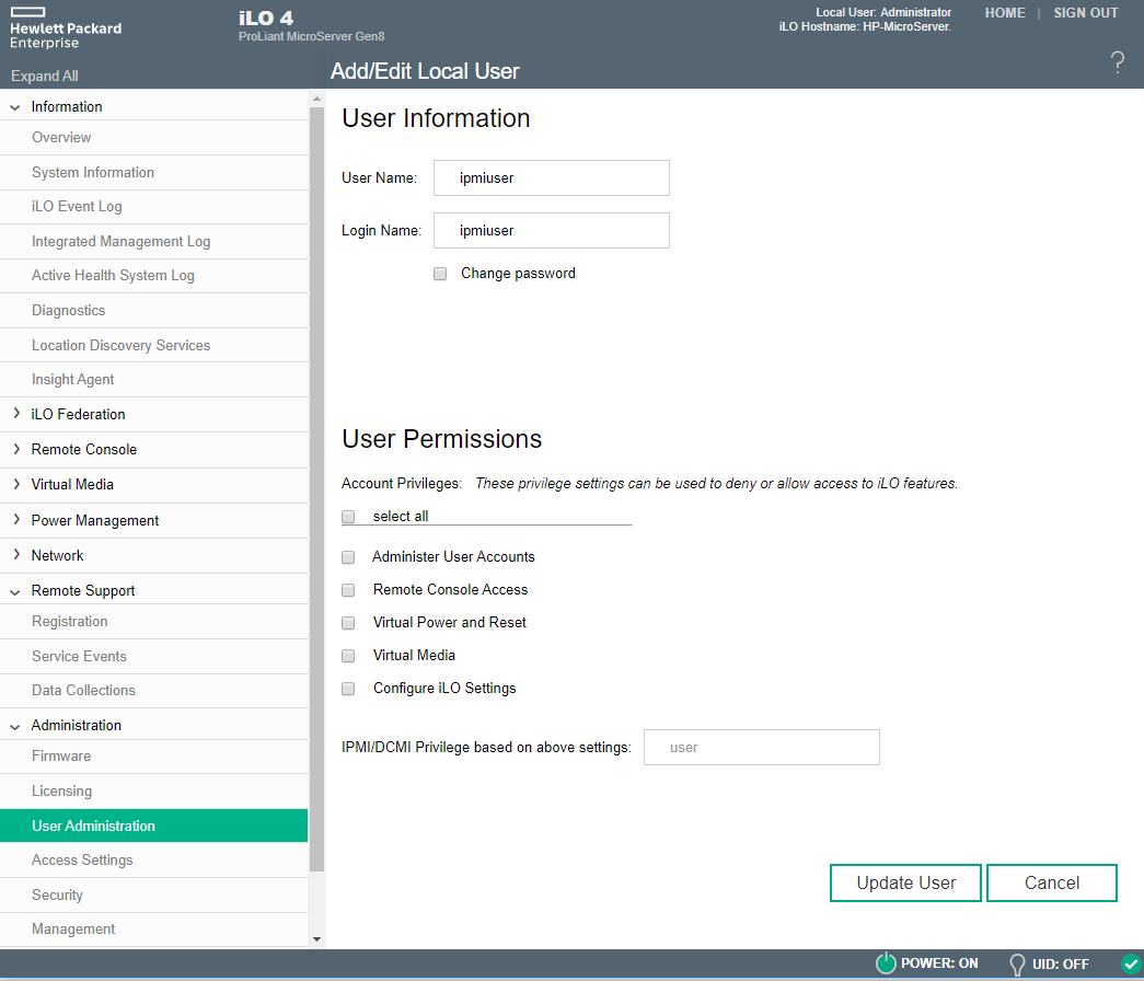 To access iLO over network it is required to create new user. Make sure to add privilege = "USER" for user created without admin permissions.