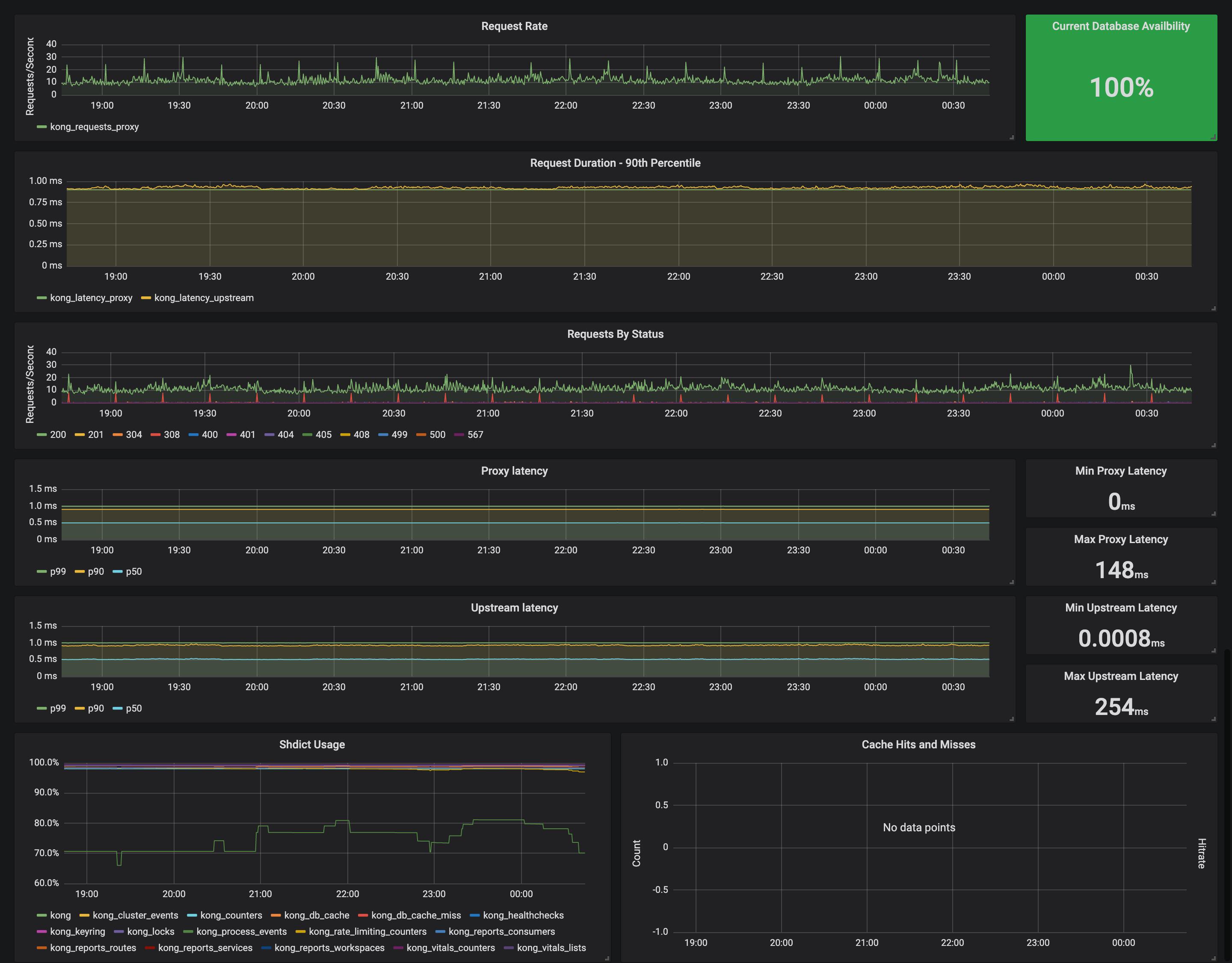 Dashboard that graphs metrics exported via Kong Enterprise Vitals Prometheus (https://docs.konghq.com/enterprise/1.3-x/admin-api/vitals/vitals-prometheus-strategy/)