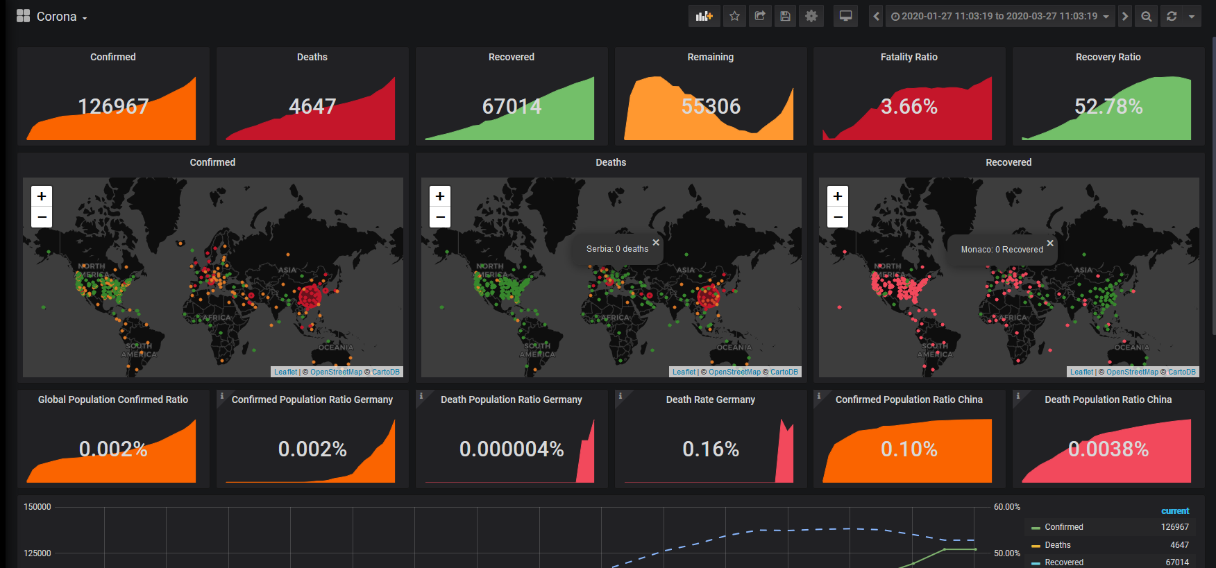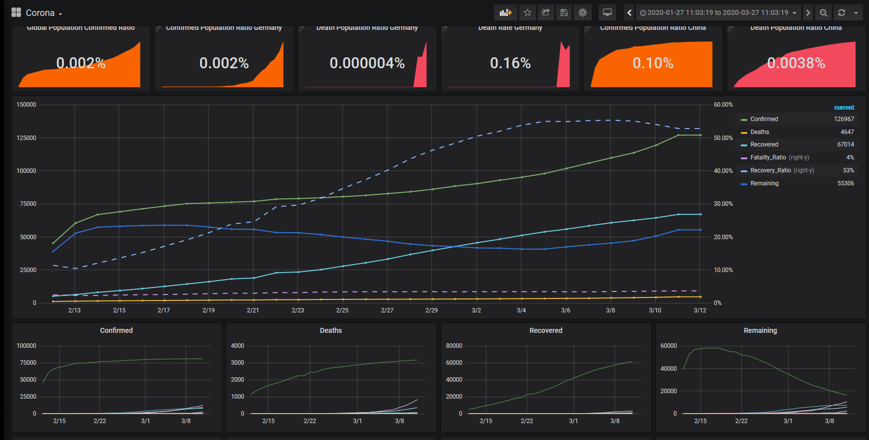 The source of the data is coming on a daily base from CSSEGISandData. Once a day the files https://github.com/CSSEGISandData/COVID-19 getting updated.