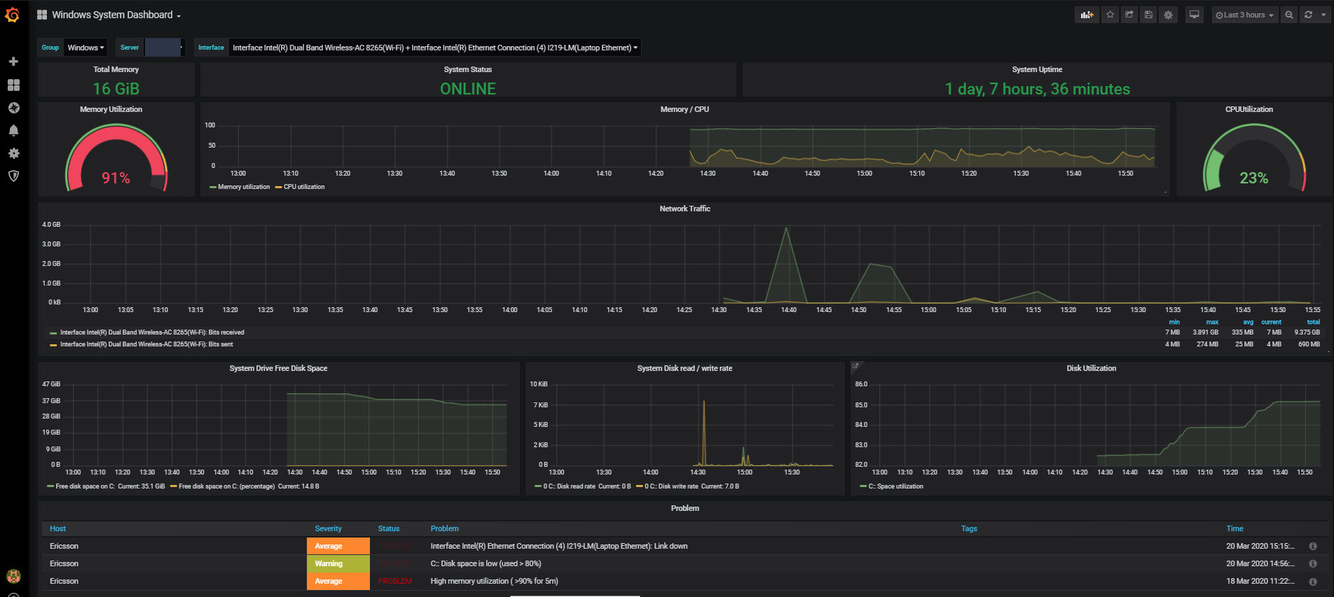 Total Memory, System Status, System Uptime, Memory Utilization, CPU Utilization, Network Traffic, System Drive Free Disk Space, System Disk read/write rate, Disk Utilization, Zabbix Problem
