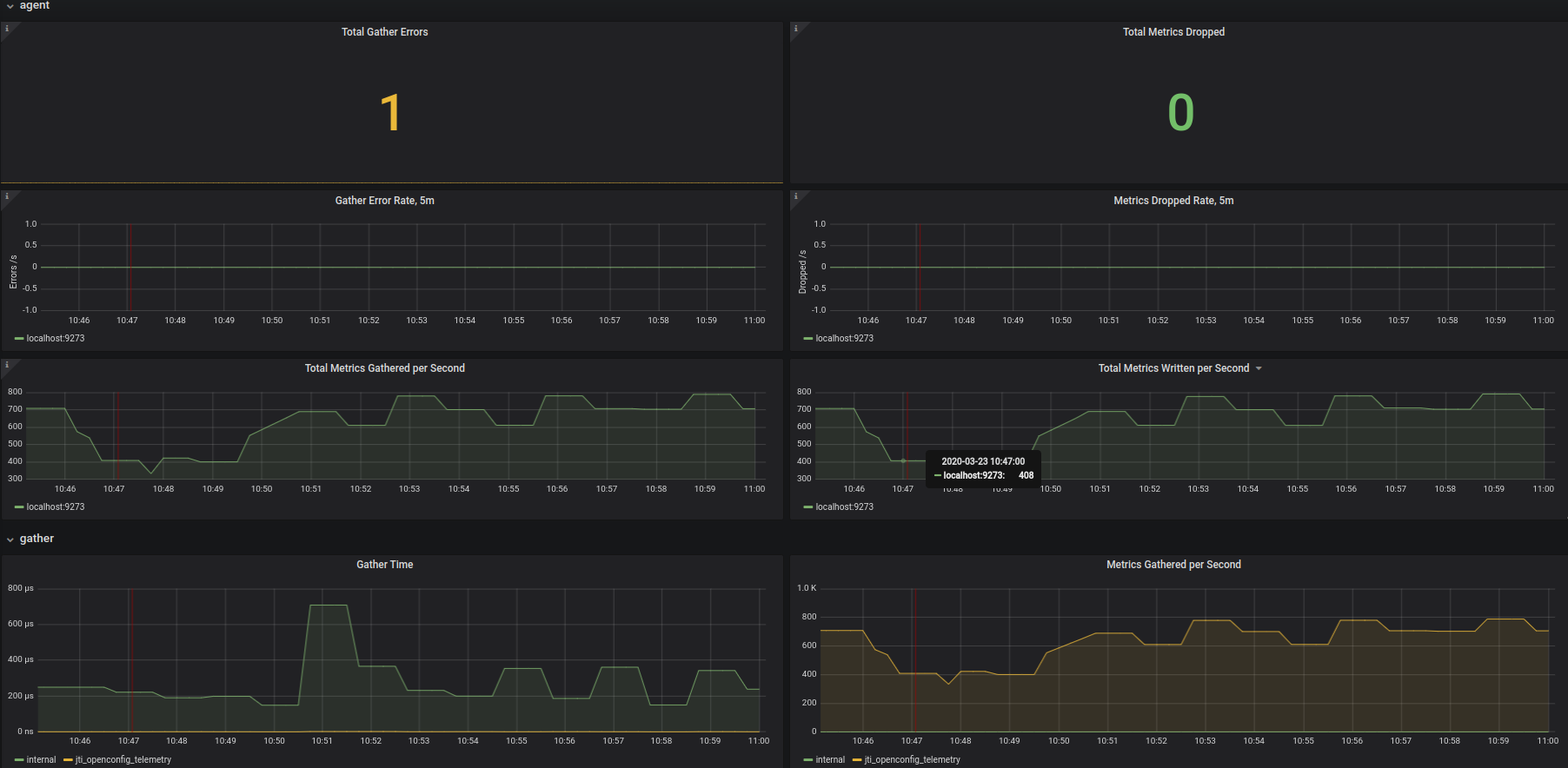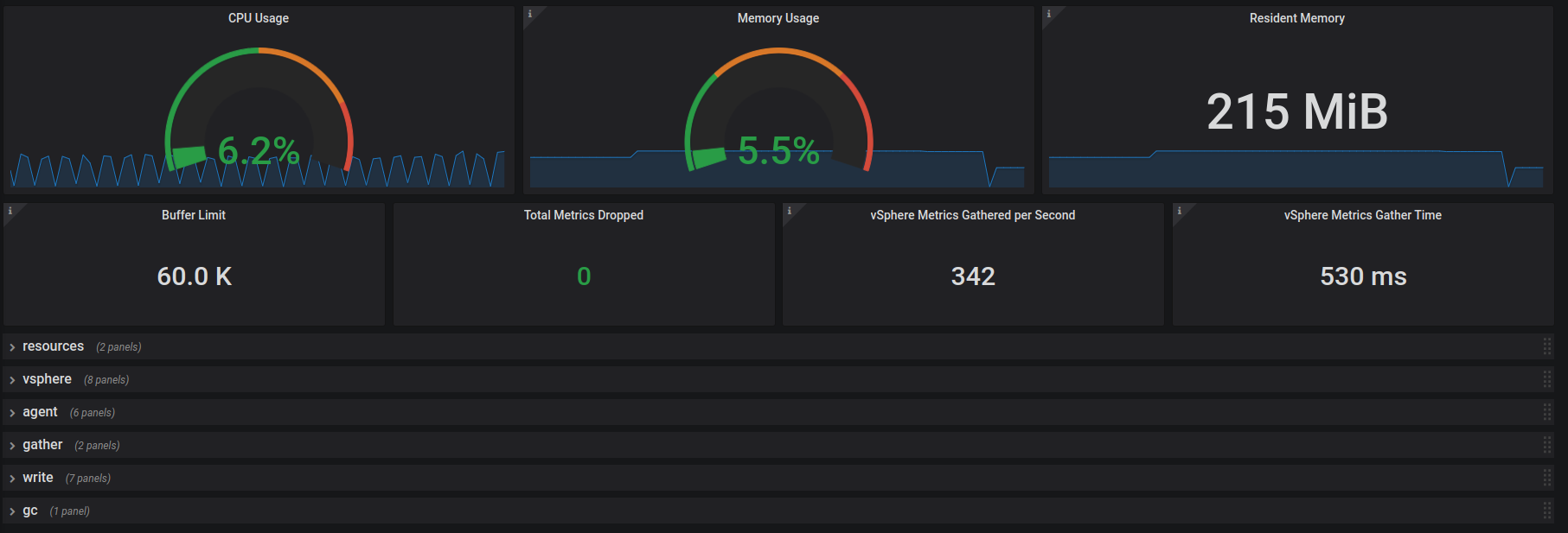 Shows internal Telegraf metrics exposed to the Prometheus output plugin.