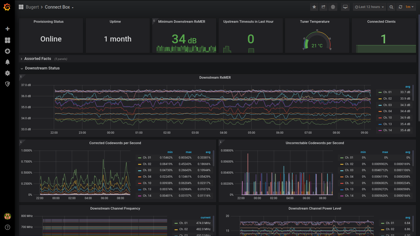 Dashboard for Compal CH7465LG cable modems (marketed as "Connect Box" by several carriers). It displays general facts about the device (provisioning status, uptime, firmware version, ...) and detailed information on downstream/upstream channels, temperature and LAN devices.