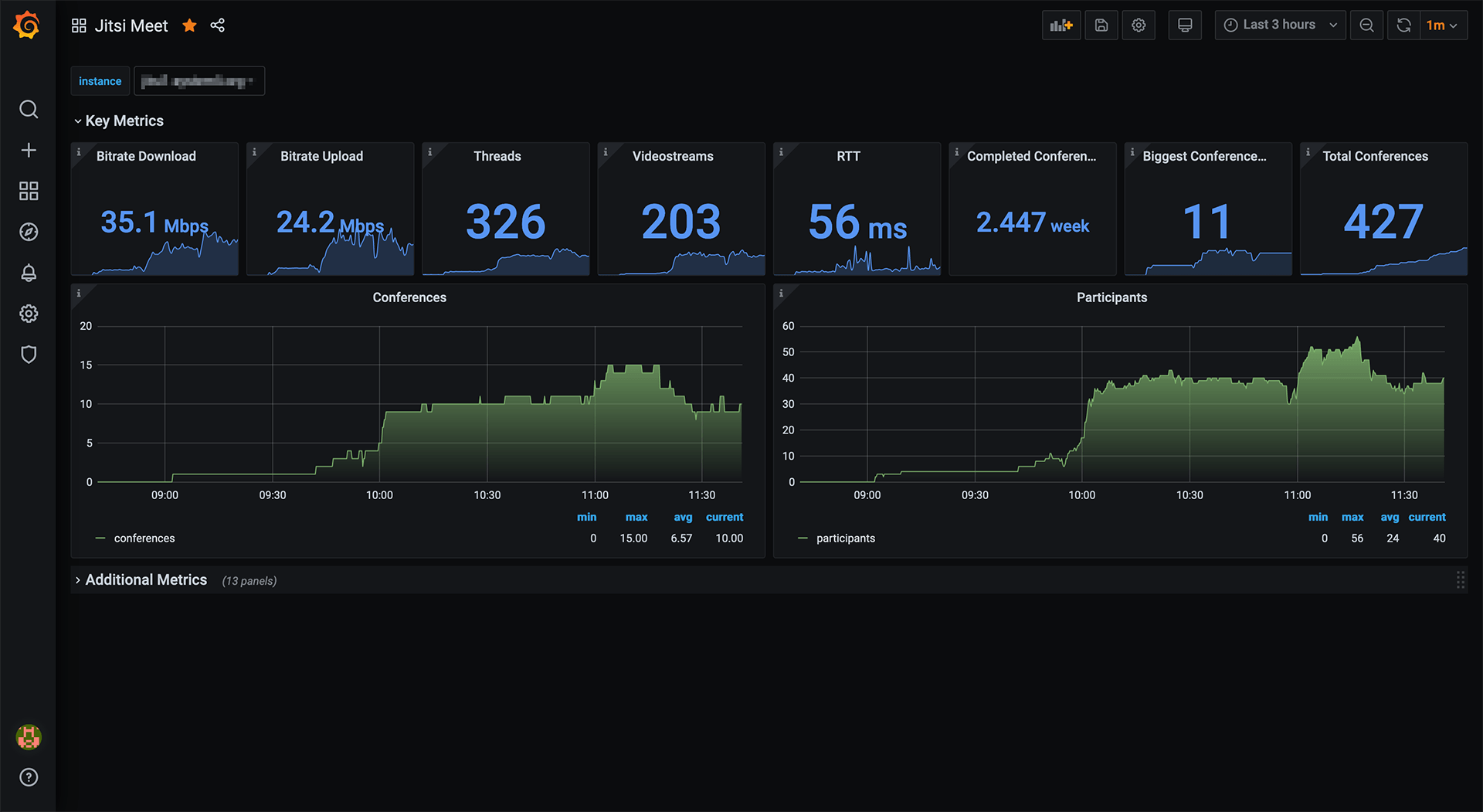 Dashboard for Jitsi Meet Exporter. It shows information about current Conferences, Participants and Bitrates. It also shows some information about Videostreams and how many minutes your instance served the conferences.