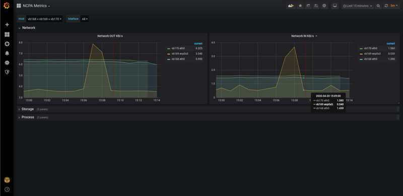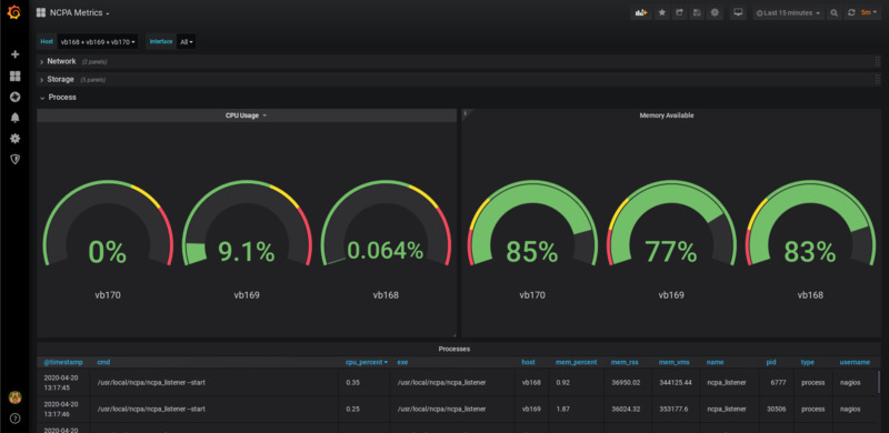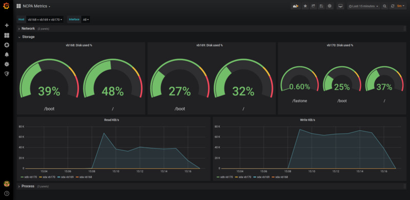 This dashboard shows a few metrics extracted from Nagios Cross-Platform Agent (ncpa) using a python script from https://github.com/juanjo-vlc/ncpa2es which uses Elasticsearch as a timeseries database.