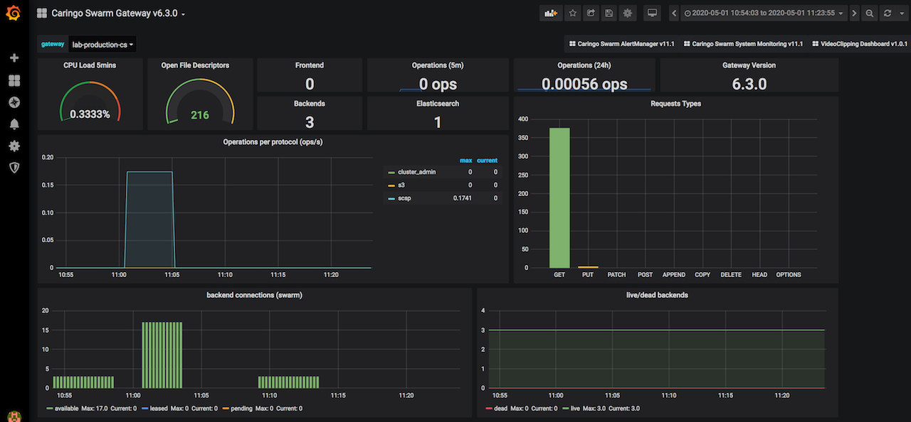 This dashboard is an example of how to visualize metrics provided by Caringo Swarm Content Gateway v6.3.0 and above. Note: some statistics will only show a value once you have done some S3 operations against the gateway.