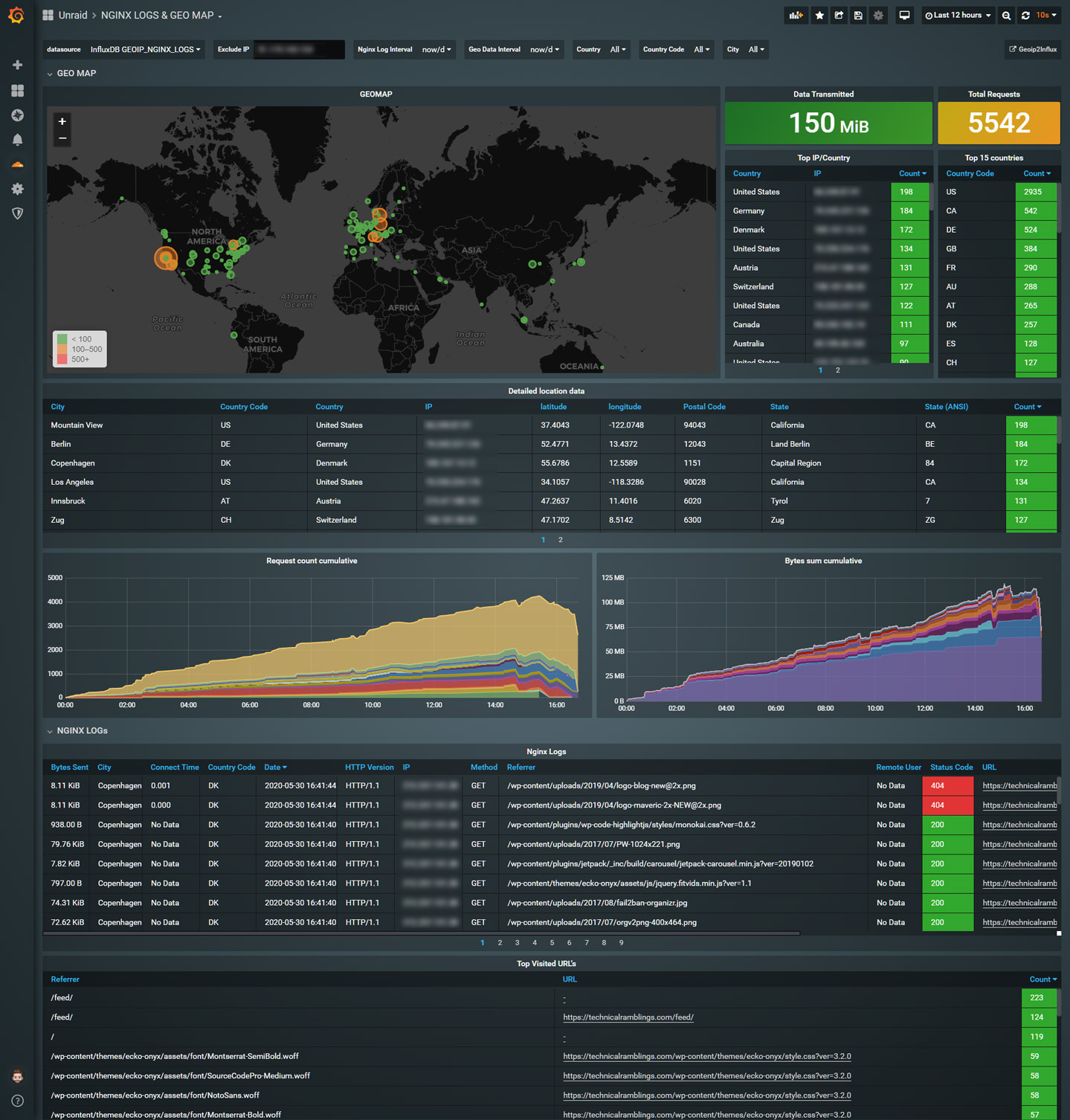 Nginx Logs and GEO map dashboard for the linuxserver/letsencrypt Geoip2Influx docker mod.