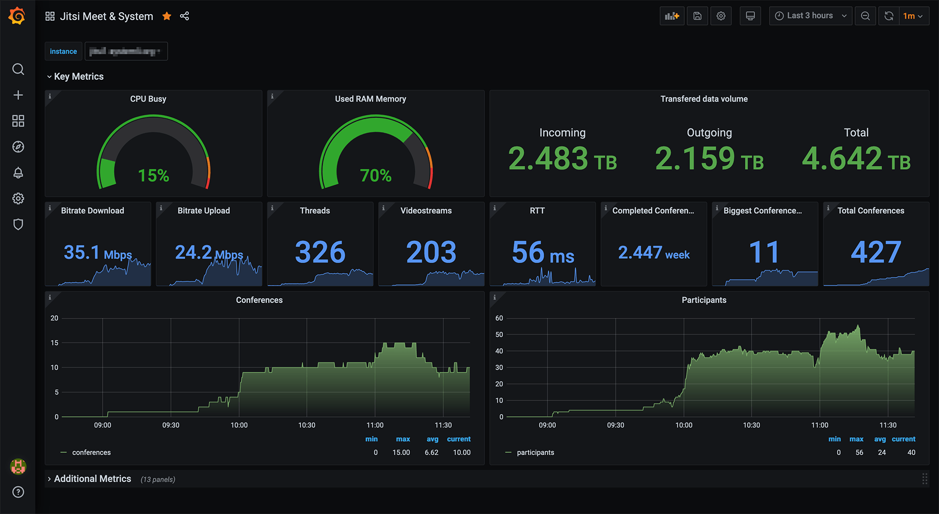 Dashboard for Jitsi Meet Exporter. It shows information about current Conferences, Participants and Bitrates. It also shows some information about Videostreams and how many minutes your instance served the conferences.
