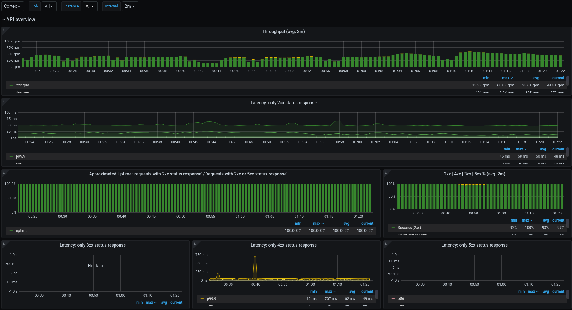 PROMETHEUS_DS: available Prometheus datasources.job: Prometheus jobs with Kamon instrumentation. Multiple selections is enabled.instance: Prometheus instances belonging to the selected jobs.interval: interval time to use in the queries: 30s, 1m, 2m, 5m, 10m, 30m, 1h, 6h, 12h, 1d, 7d, 14d, 30d.