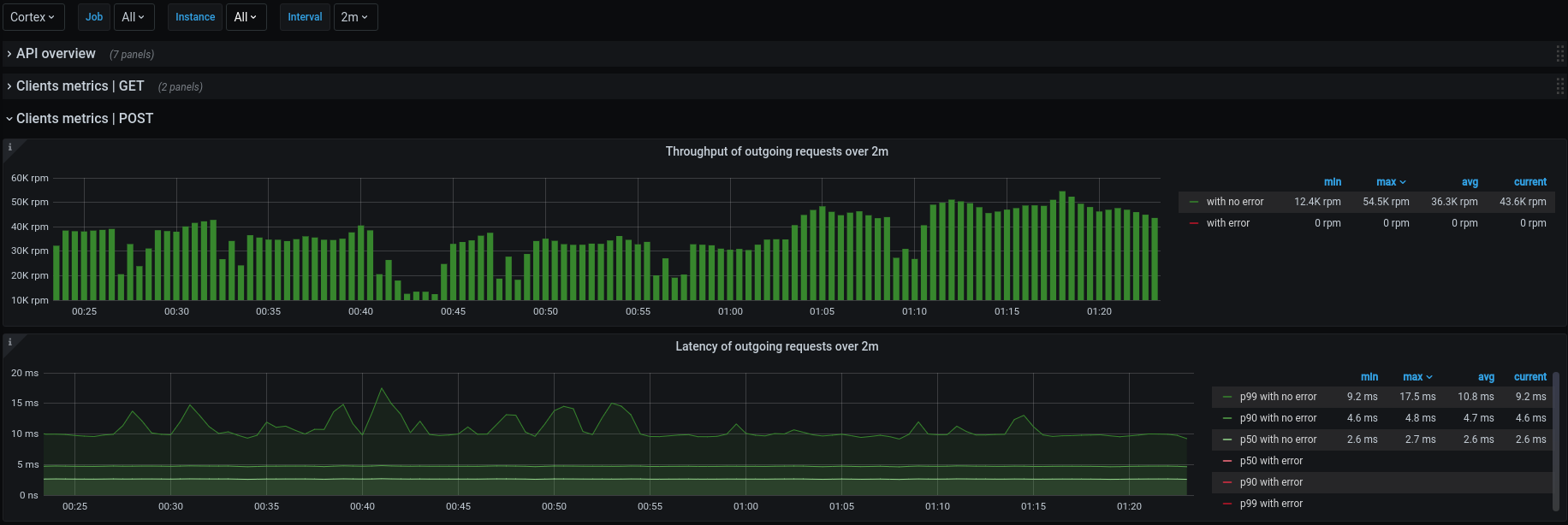 - Client metrics: throughput and latency for client side. One row for each operation.