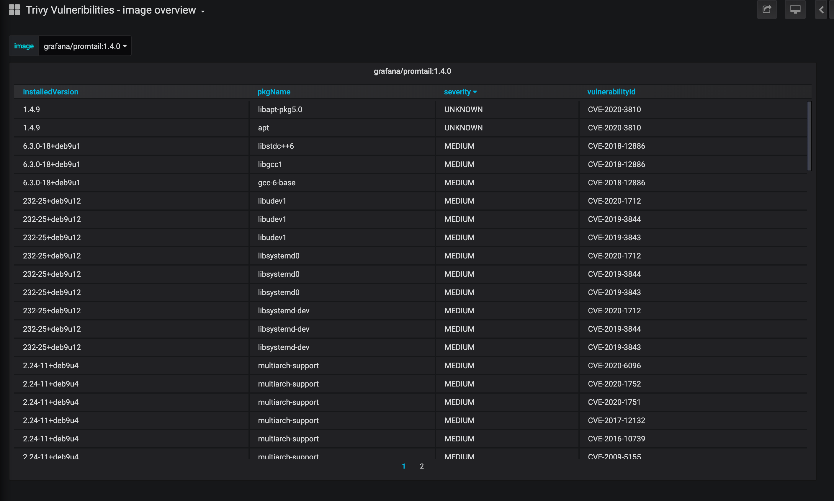 Dashboard for Kube Trivy Exporter https://github.com/kaidotdev/kube-trivy-exporter For an overview install this dashboard alongside https://grafana.com/grafana/dashboards/12331
