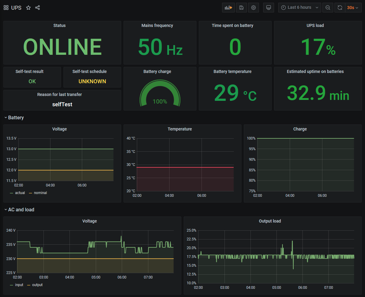 This dashboard consumes data collected by a SNMP daemon using apcupsd-snmp, which is made available to Prometheus by the Prometheus SNMP exporter. My data flow is UPS -> USB -> Linux box -> apcupsd -> snmpd -> Prometheus SNMP exporter -> Prometheus -> Grafana. The name of the metrics generated by the exporter typically match the Powernet MIB.