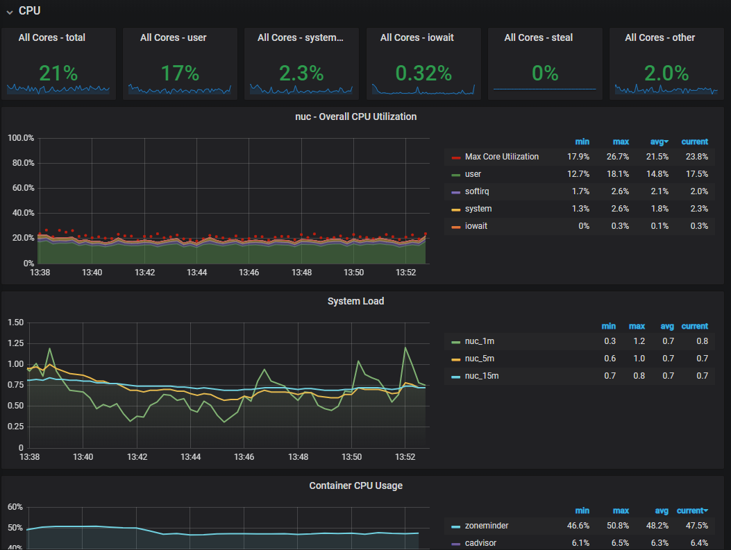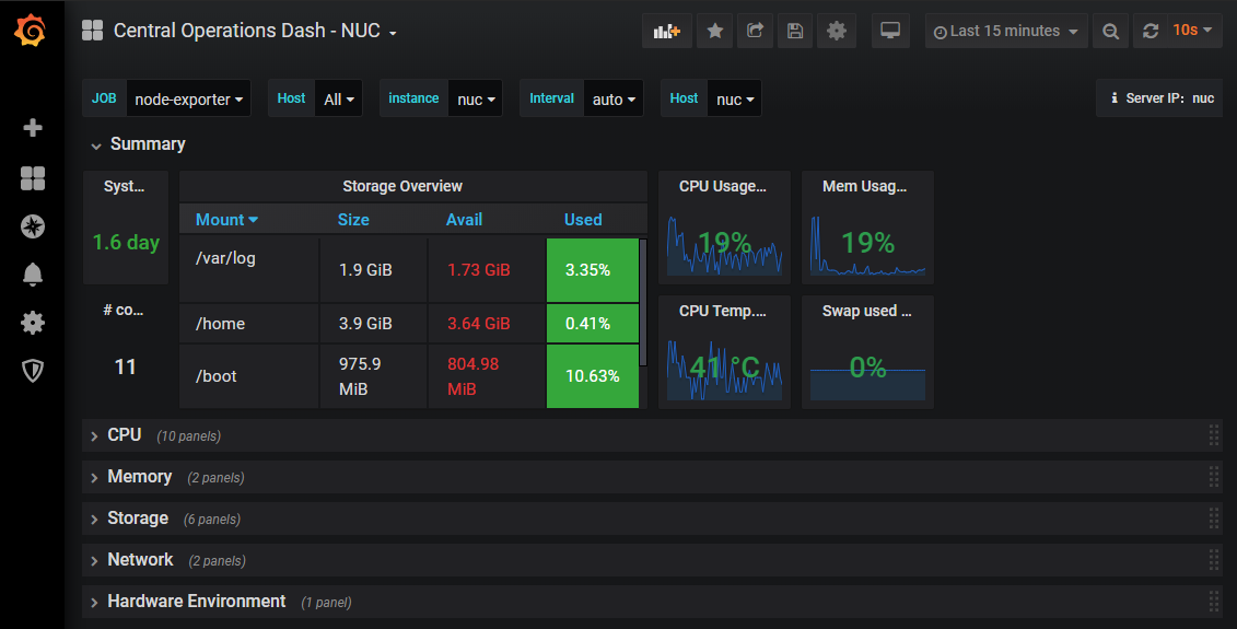 Inspired by A LOT of others, this is my go-to-dash. Change the $node variable as I use this for Node-exporters 'nuc'. A collection of Node-Exporter, Cadvisor and Prometheus.