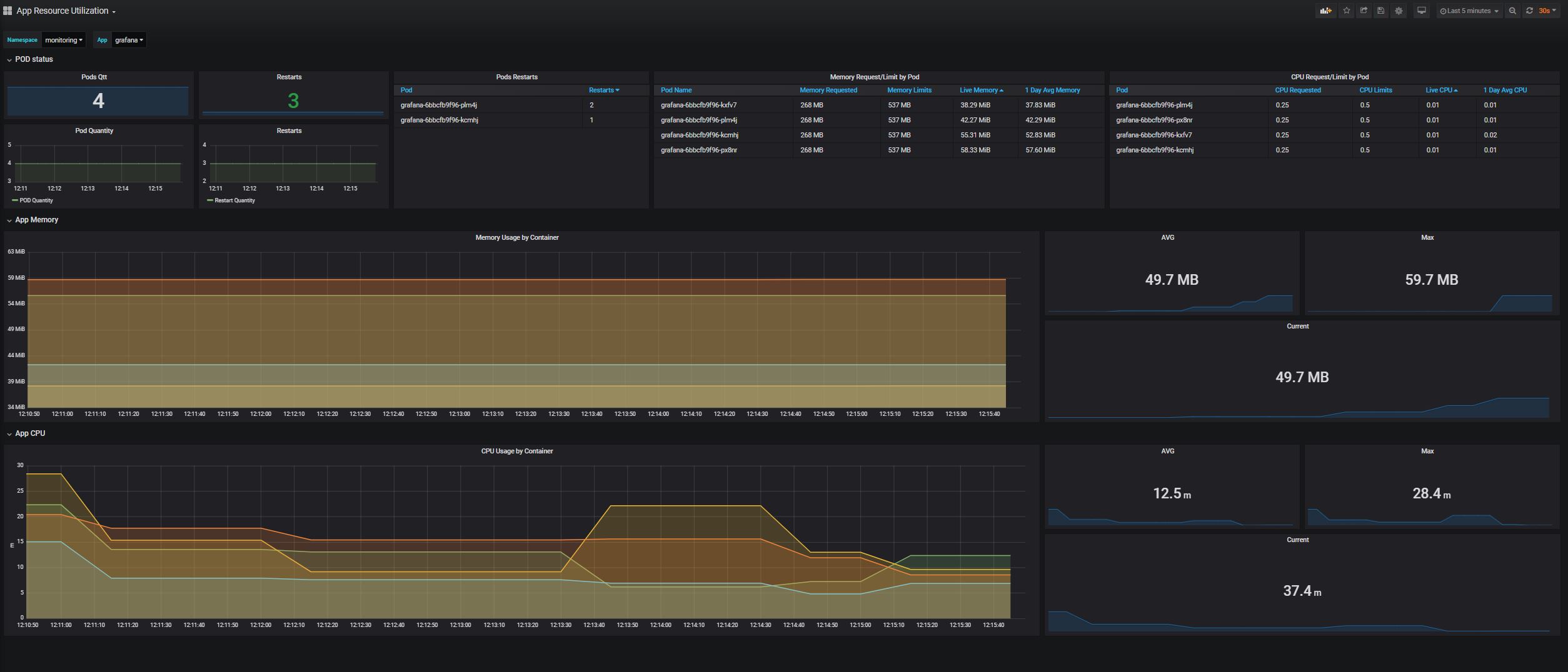 This dashboard will show you Memory and CPU usage from all apps and namespaces.