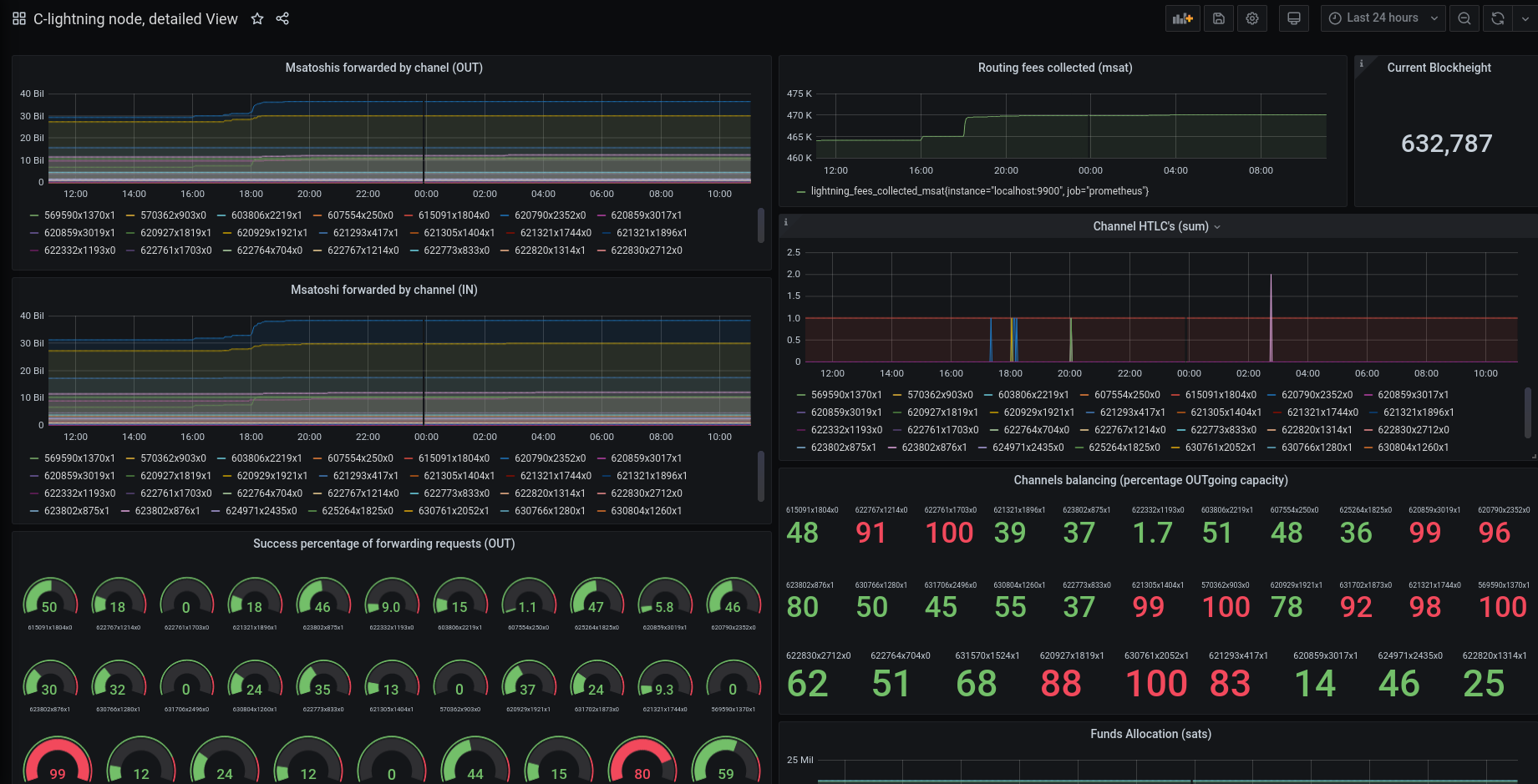 This dashboard was modified from Lisa Neigut's (@niftynei) one and I kept the HTLCs, funds allocation and blockheight panel from it.