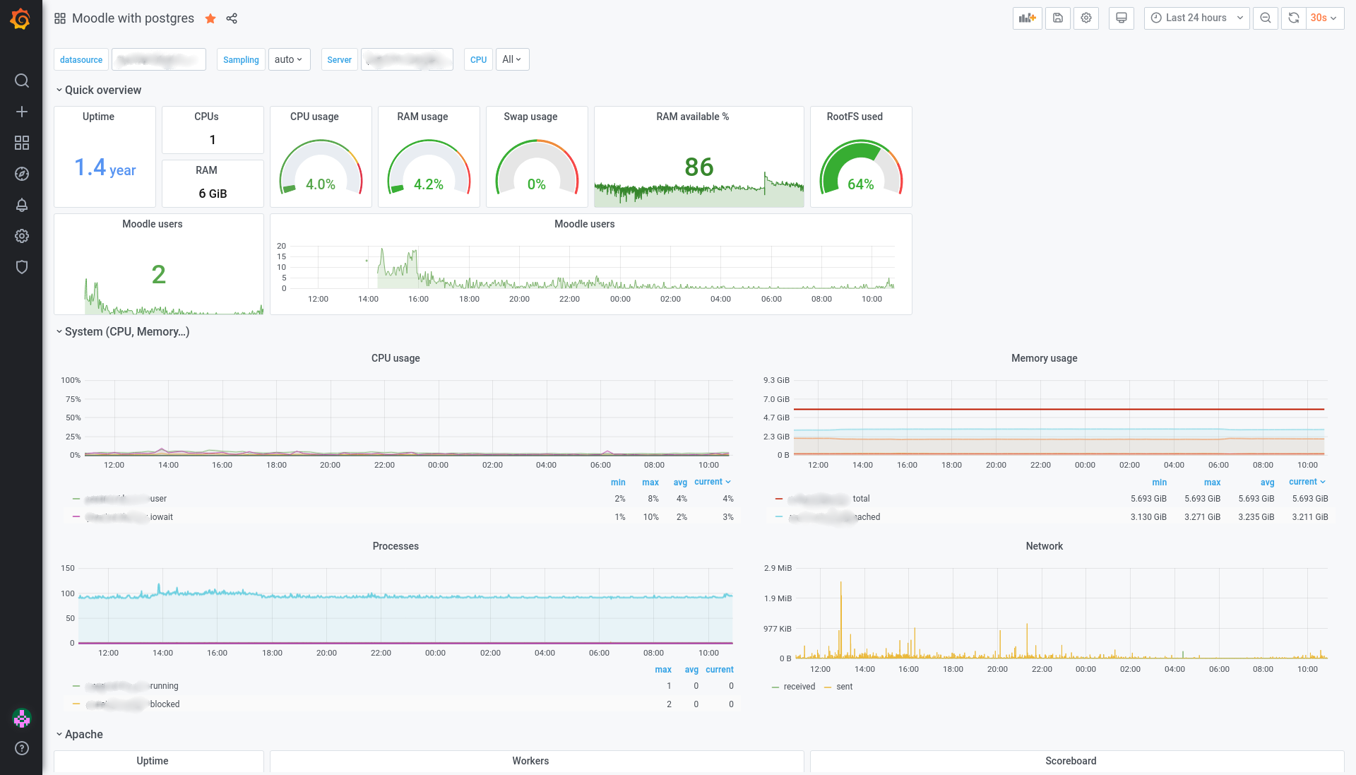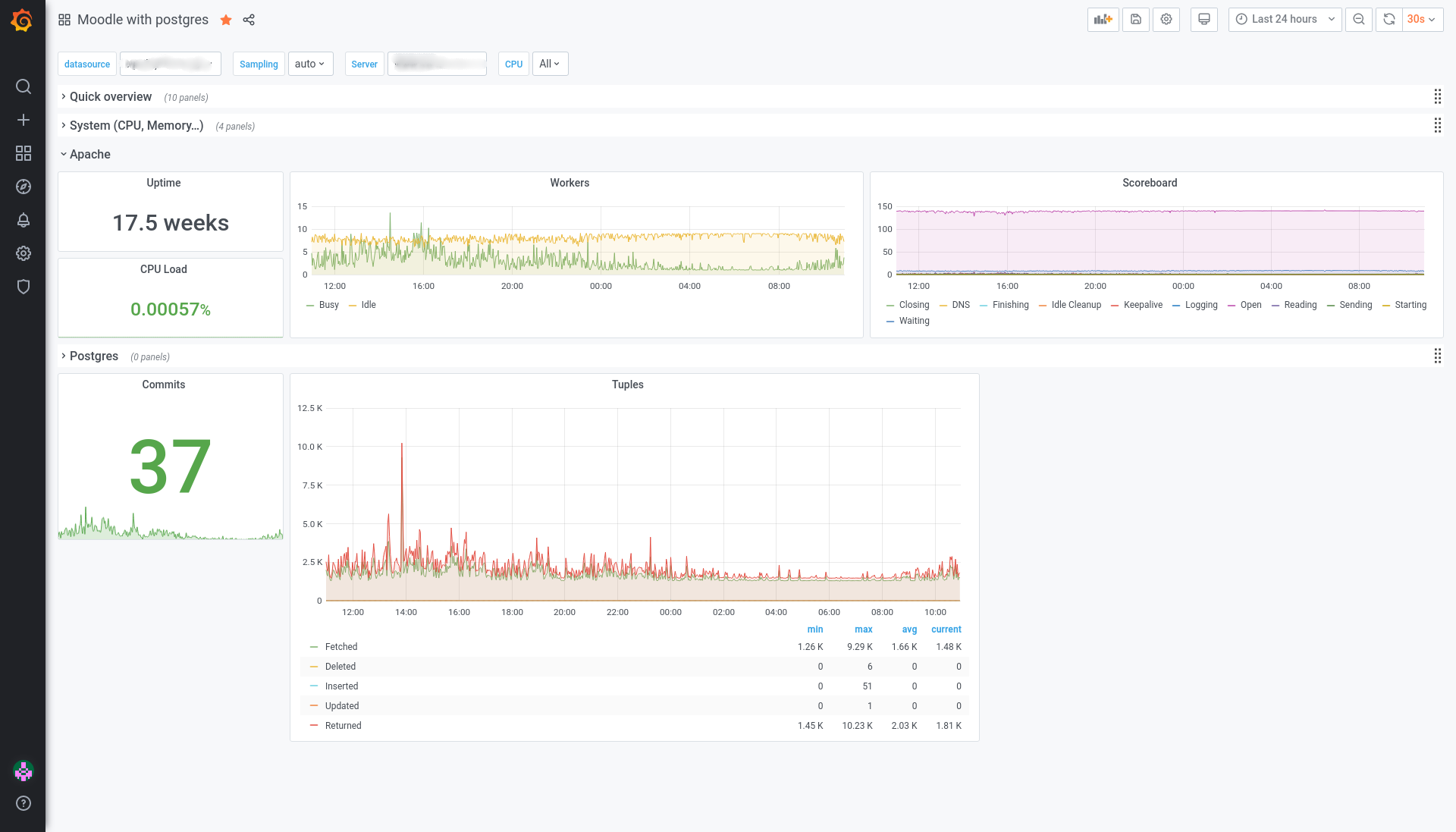 Dashboard for moodle with postgresql. - system overview - apache overview - postgresl ovelview - number of moodle users