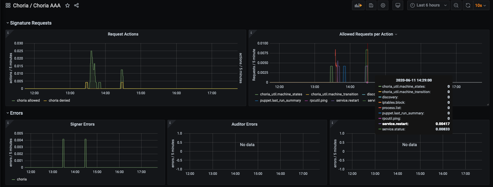 Dashboard show authorizations, logins and signing requests for the Choria AAA Service broken down by site